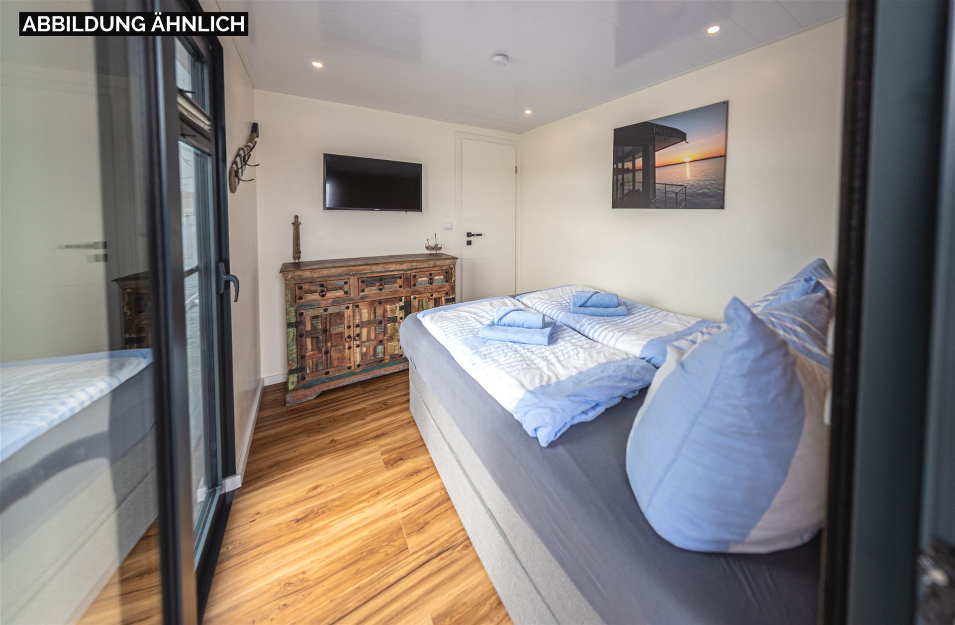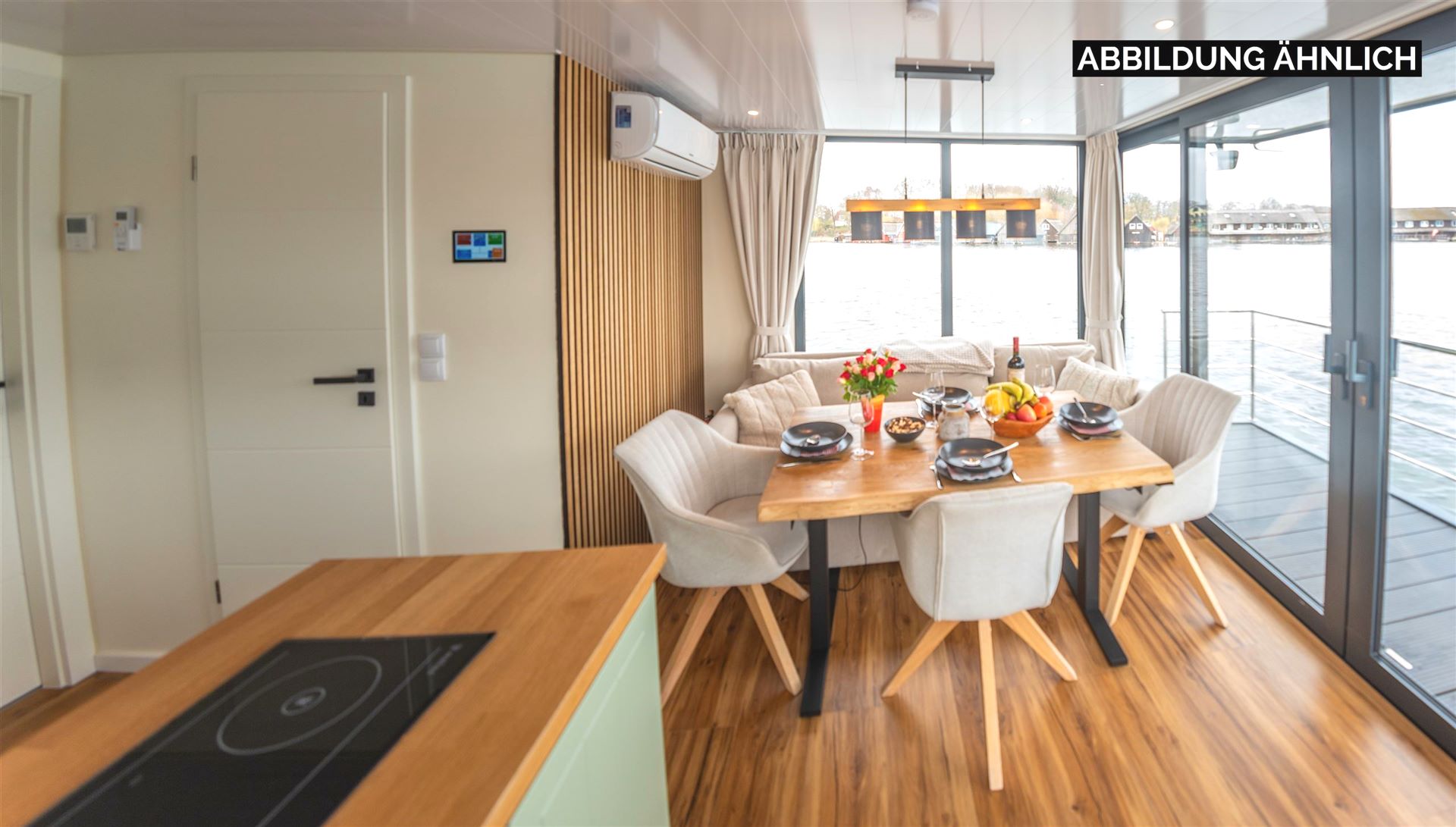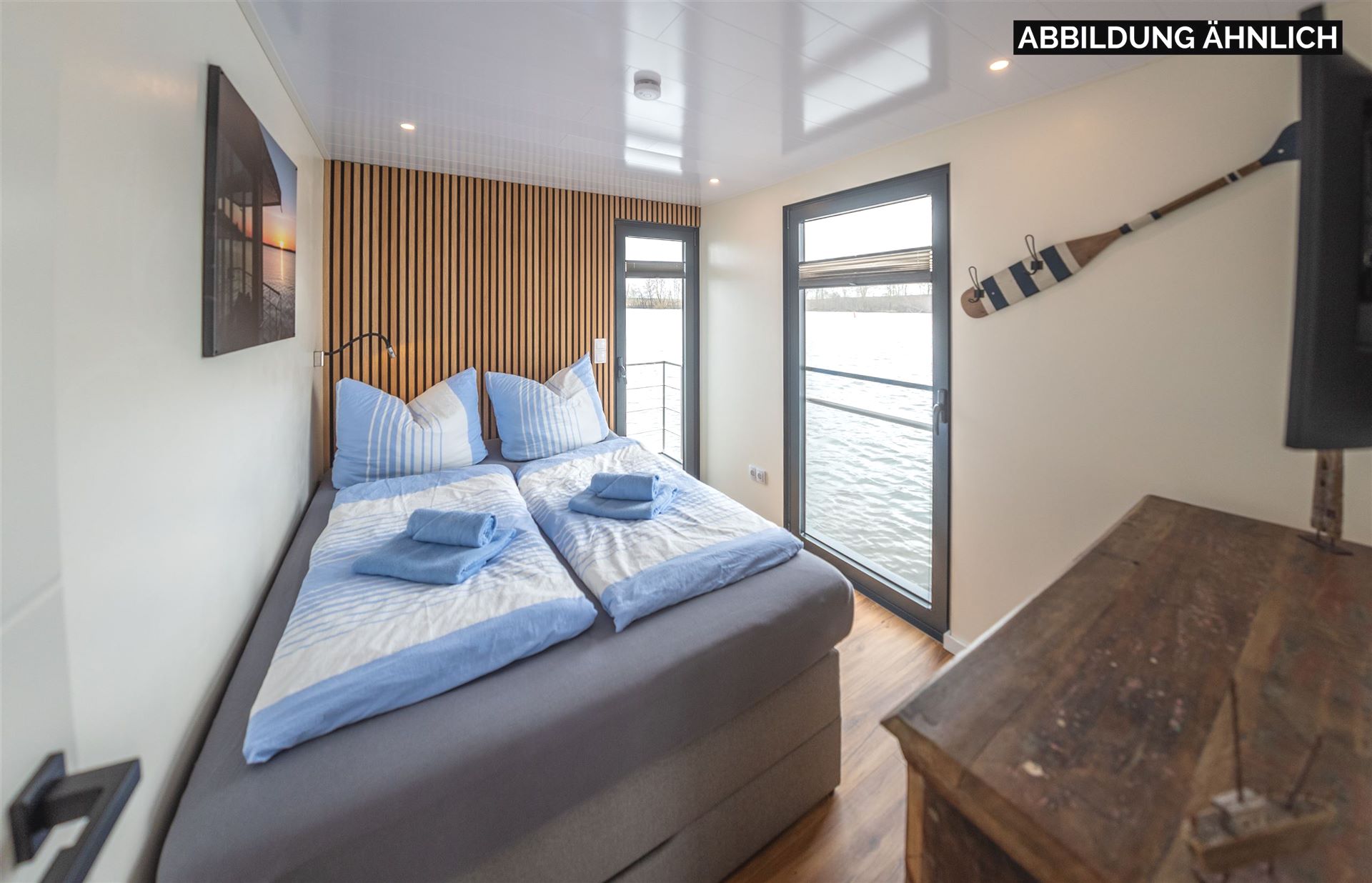 Ein Highlight sind die großzügigen Außenbereiche: Die überdachte Terrasse vor dem Wohnbereich lädt zum Frühstücken ein, während die große Dachterrasse mit Lounge-Möbeln ideal zum Sonnenbaden, Lesen oder Grillen ist. Von den beiden Schlafzimmern aus haben Sie direkten Zugang zur Heckterrasse mit Badeplattform und Außendusche – perfekt für eine Erfrischung nach einem Bad im See.