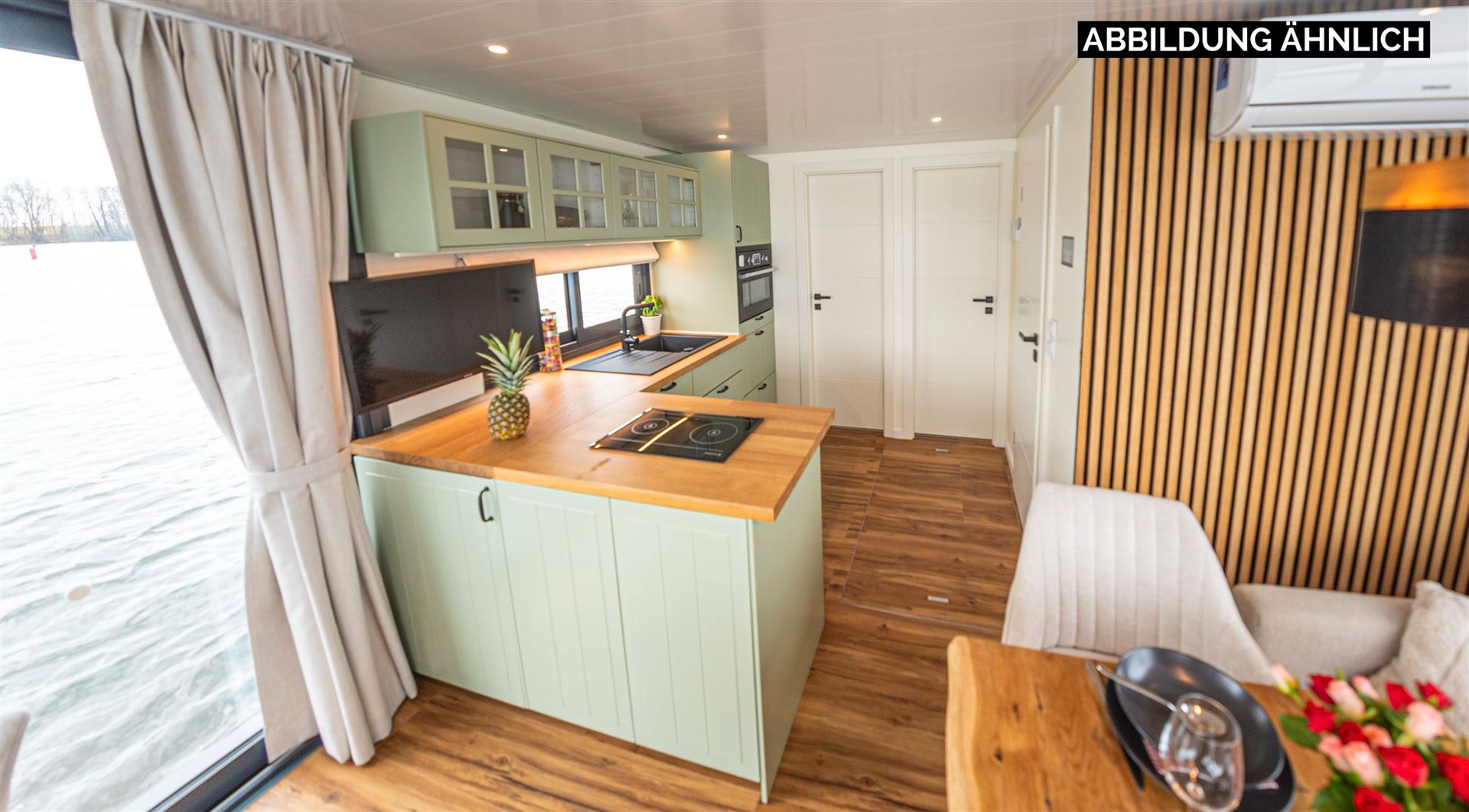 Im Zentrum des Bootes befindet sich der gemütliche Wohnbereich mit bodentiefen, aufschiebbaren Fenstern. Hier können Sie gemeinsame Mahlzeiten genießen, entspannen oder den Sonnenuntergang beobachten.