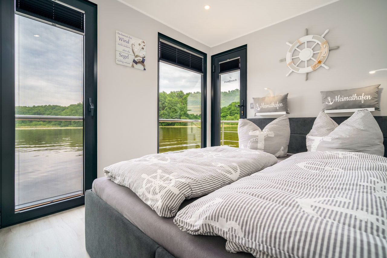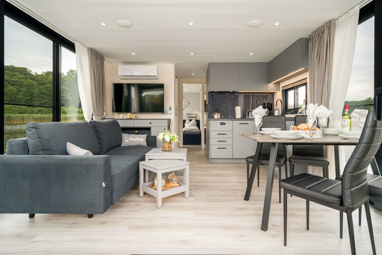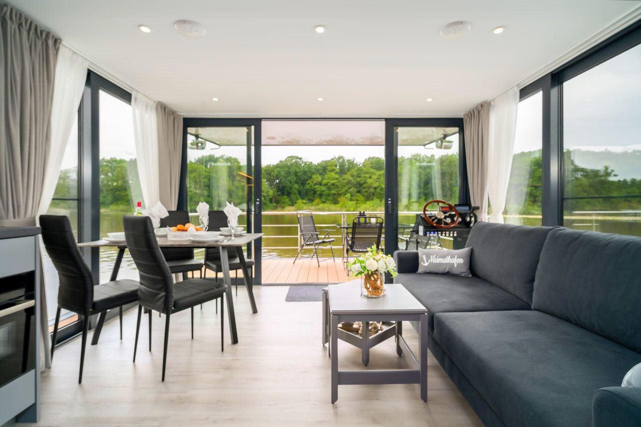 Vom Salon mit den bodentiefen, aufschiebbaren Panoramafenstern und der ausklappbaren gemütlichen Schlafcouch genießen Sie einen herrlichen Ausblick auf Wasser der Müritz, dem Plauer See, der Havel oder der Natur des Müritz Nationalpark.