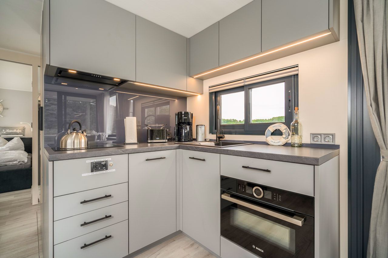 Die Küche ist ausgestattet mit einem großen Kühlschrank und kleinem Gefrierfach, einer Spüle mit Warmwasser, einem Diesel-Kochfeld, Geschirrspüler und einem modernen Backofen mit Mikrowellenfunktion. Selbstverständlich steht auch eine Kaffeemaschine mit Thermoskanne, ein Wasserkessel, Toaster, Geschirr, Besteck, Töpfe und Pfannen sowie diverse Küchenhelfer zur Verfügung.