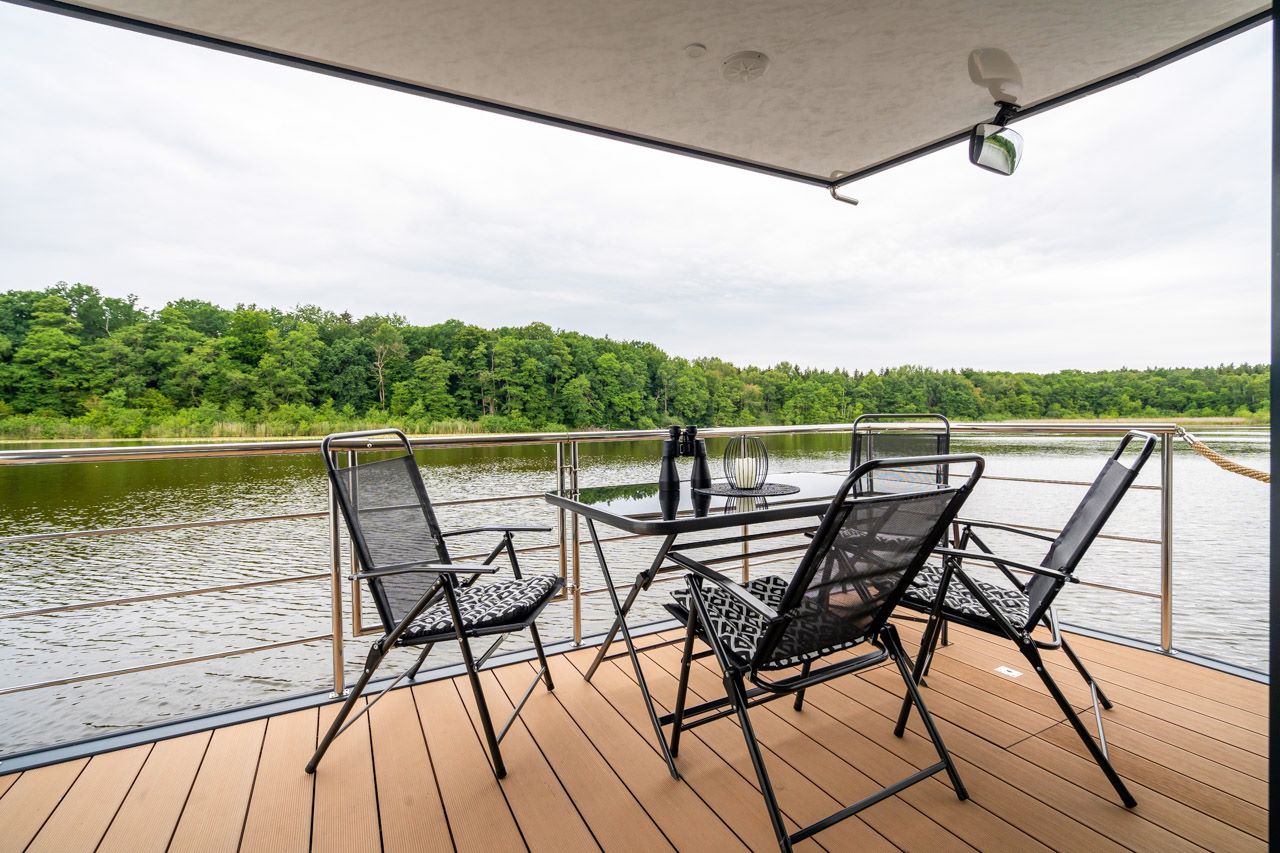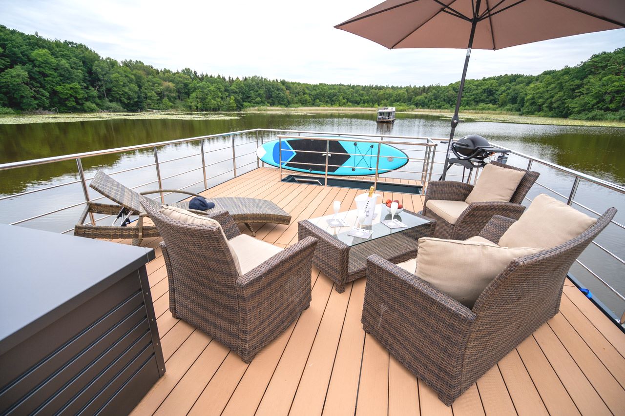 Bei gutem Wetter sitzen Sie sicherlich gern auch auf der großen, überdachten Bugterrasse – hier können Sie auch Ihre Mahlzeiten einnehmen oder grillen. Einen entsprechenden Grill können Sie direkt bei uns ausleihen. So ein Grillabend auf einem Hausboot ist schon was Feines!