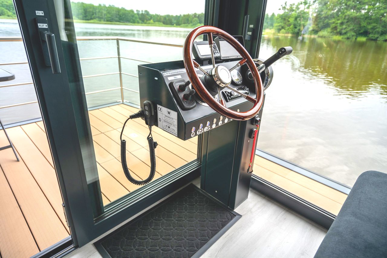 Im Salon befindet sich neben der Küchenzeile auch der innenliegende Steuerstand, von dem aus das Hausboot über die Seen und durch die Kanäle gesteuert werden kann. Für den MÜRITZ-captain steht modernste Navigationstechnik und ein starker 60 PS Motor zum Erreichen Ihres Ziels zur Verfügung. Für das Führen des Mietboot wird ein Sportbootführerschein Binnen benötigt. Jedoch können Sie das Hausboot führerscheinfrei mieten, wenn Sie nicht im Besitz eines Sportbootführerschein Binnen sind, in diesem Fall können Sie bei uns den Charterschein machen. Weitere Informationen dazu, finden Sie auf unserer Seite: Charterschein Das vorhandene Bug- und Heckstrahlruder machen das Manövrieren des Hausbootes nach entsprechender Einweisung und kurzer Übungszeit nahezu kinderleicht.