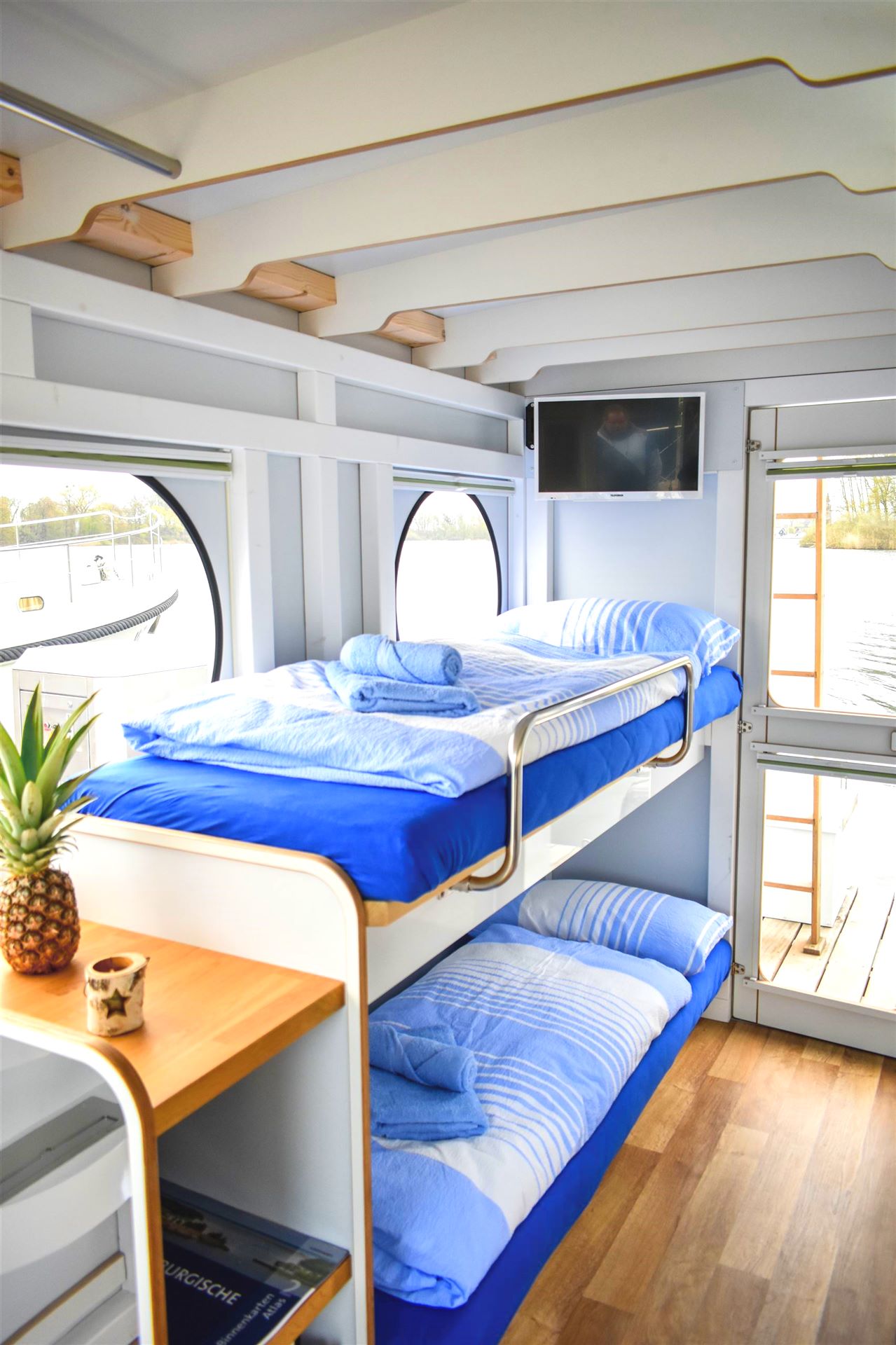 Im gemütlichen Wohn- und Schlafbereich haben Sie in einem Doppelstockbett zwei feste Schlafplätze mit einer Größe von jeweils 0,80 m x 2,00 m. Mit nur wenig Handgriffen verwandelt sich die Sitzecke in zwei weitere Schlafplätze mit einer Liegefläche von ca. 1,40 m x 2,00 m. Im gemieteten Hausboot befindet sich unter den jeweiligen Betten jede Menge Stauraum.