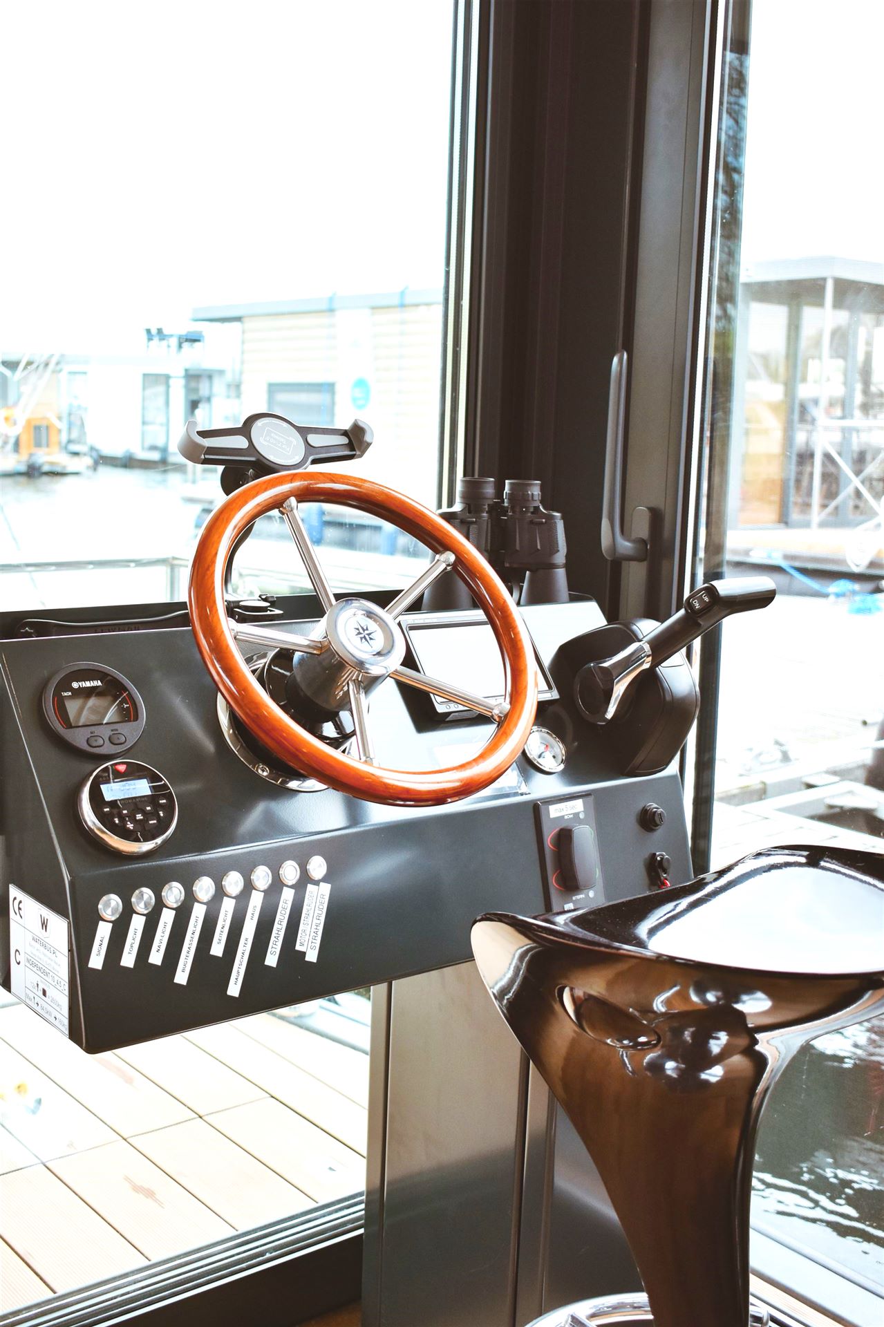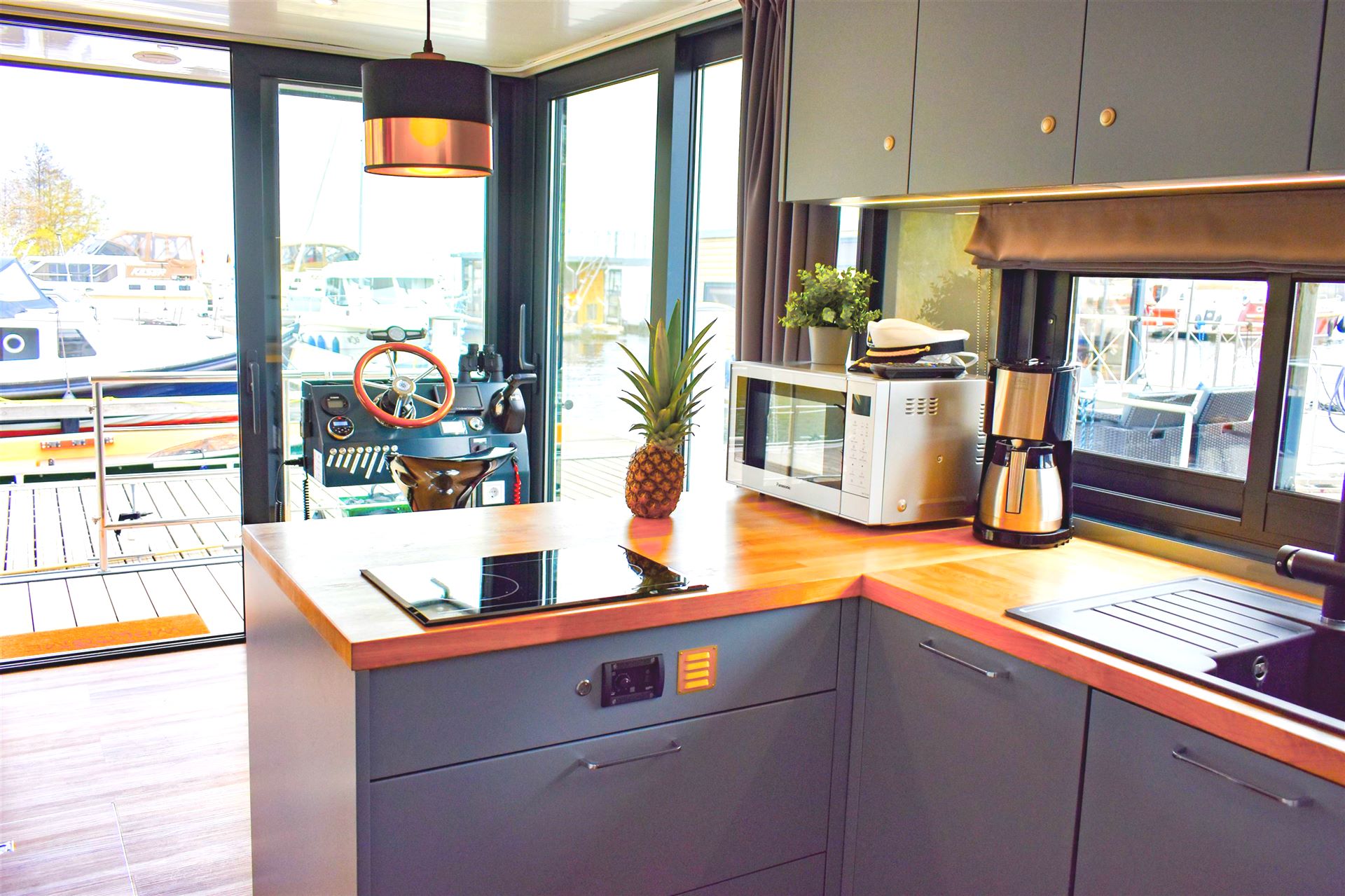 Auf dem Hausboot befindet sich der Steuerstand im Wohnzimmer, so ist eine Fahrt auch bei Schietwetter möglich.