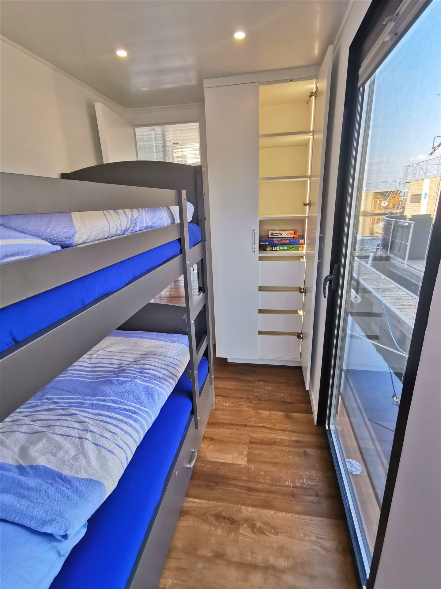 Die Schlafzimmer sowie das Bad befinden sich im Achterdeck und sind mit einer Tür vom 15 m² großen Wohn- & Essbereich getrennt. Die Schlafzimmer bieten für Personen Platz. Die Offizierskabine ist mit einem Doppelbett ausgestattet. In der zweiten Kajüte gibt es für Leichtmatrosen ein Hochbett. Neben dem Hochbett kann ein weiteres Bett ausgezogen werden.