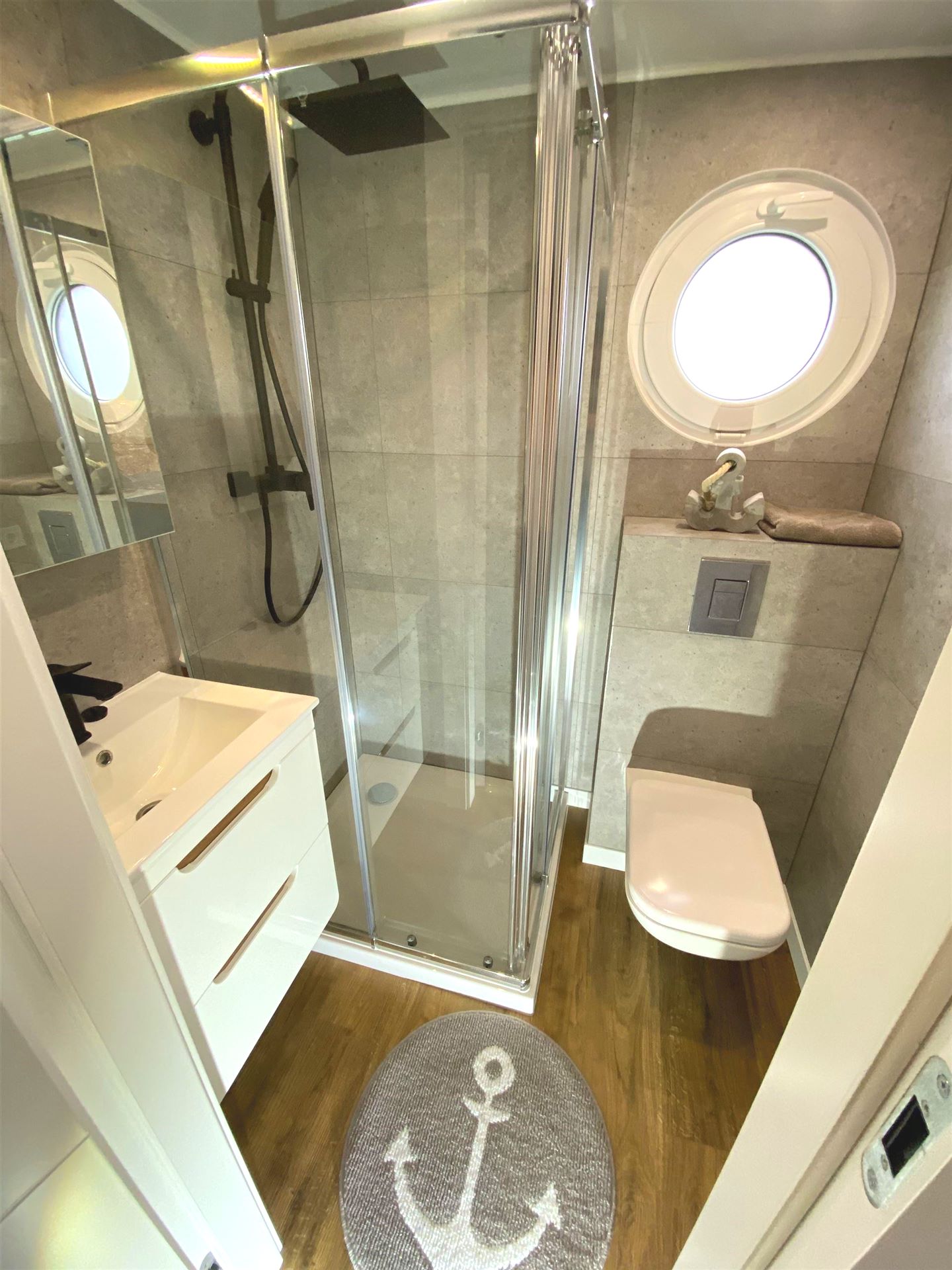 Das Bad auf dem gemieteten Hausboot ist mit Dusche, Waschtisch und einem WC ausgestattet.