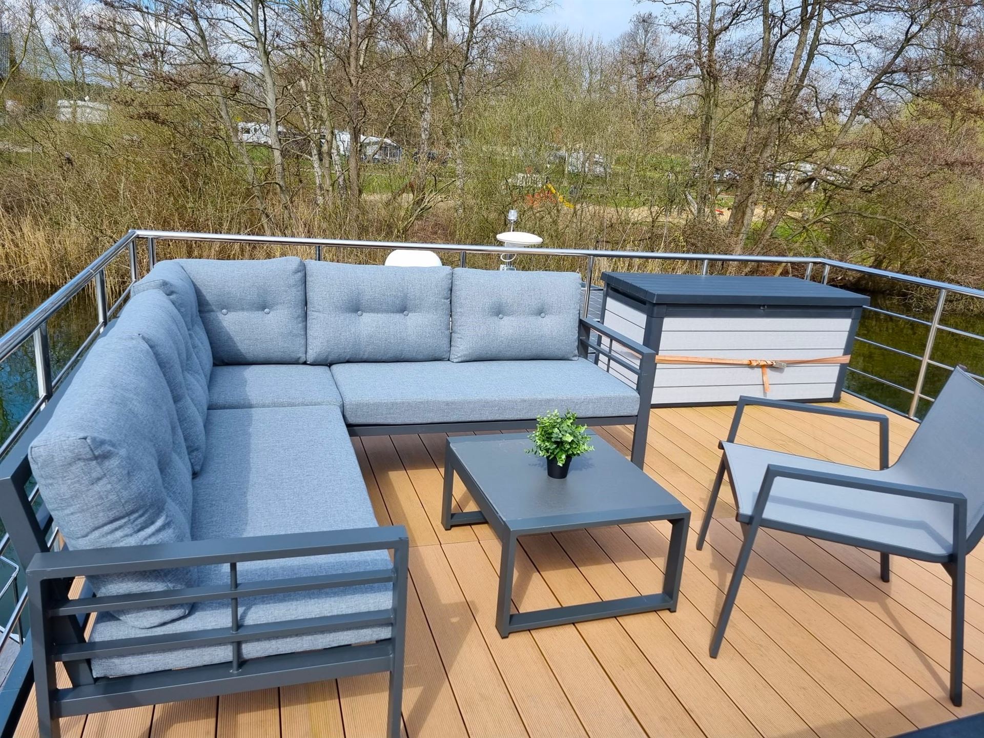 Die 20 m² große Dachterrasse des Mietbootes lädt ein die umliegende Landschaft der Kleinseenplatte zu beobachten oder einfach die Seele baumeln zu lassen. Genießen Sie wunderschöne Sonnenstunden auf dem gecharterten Hausboot.