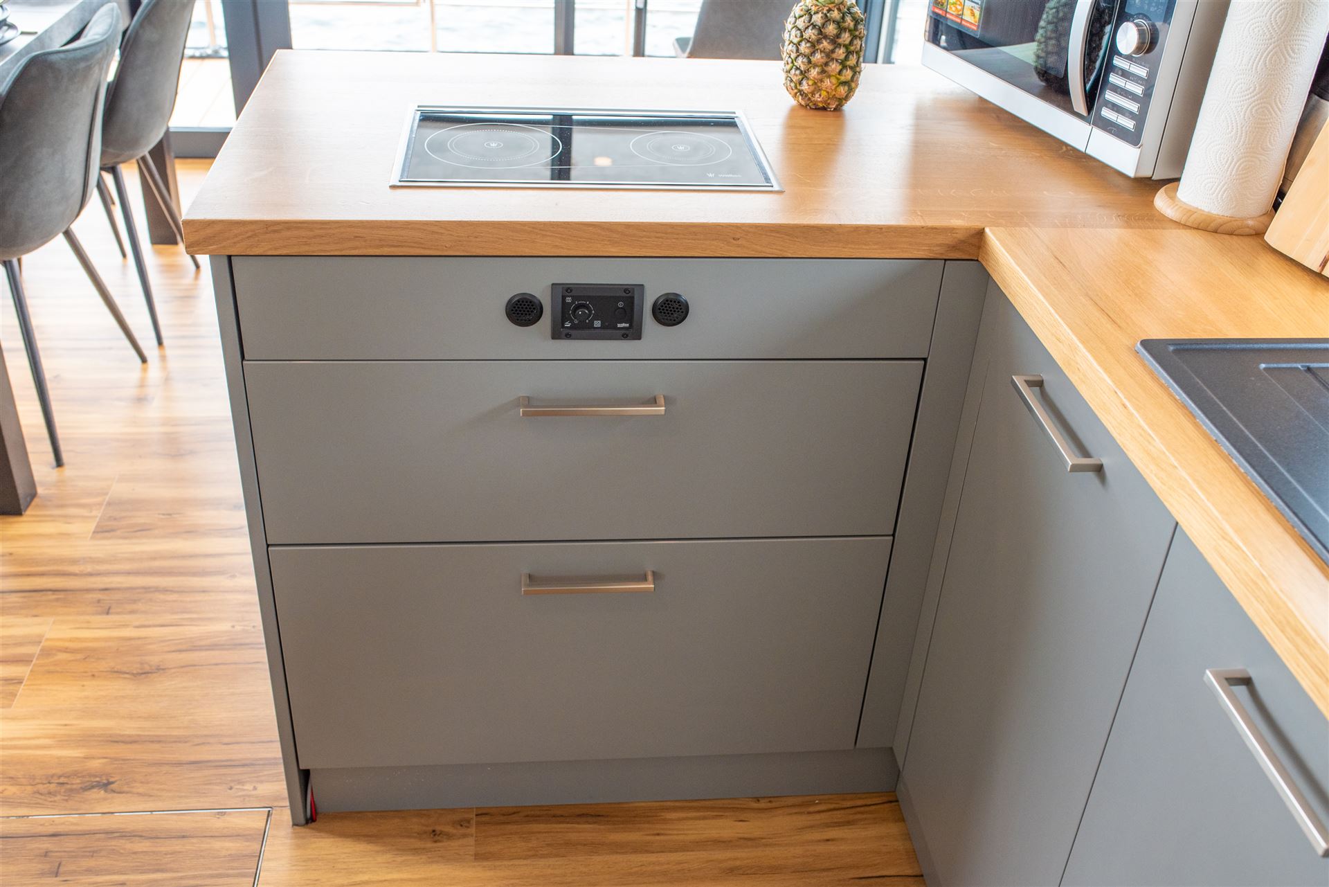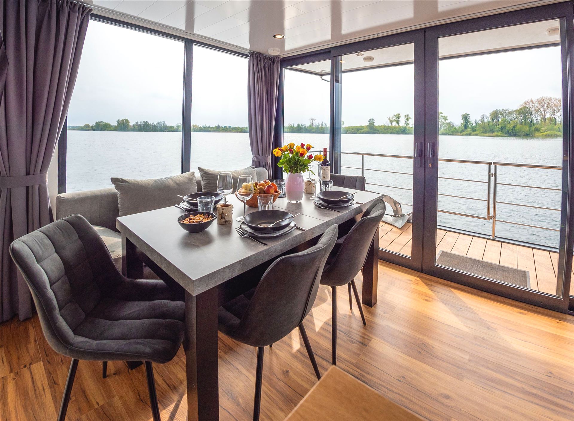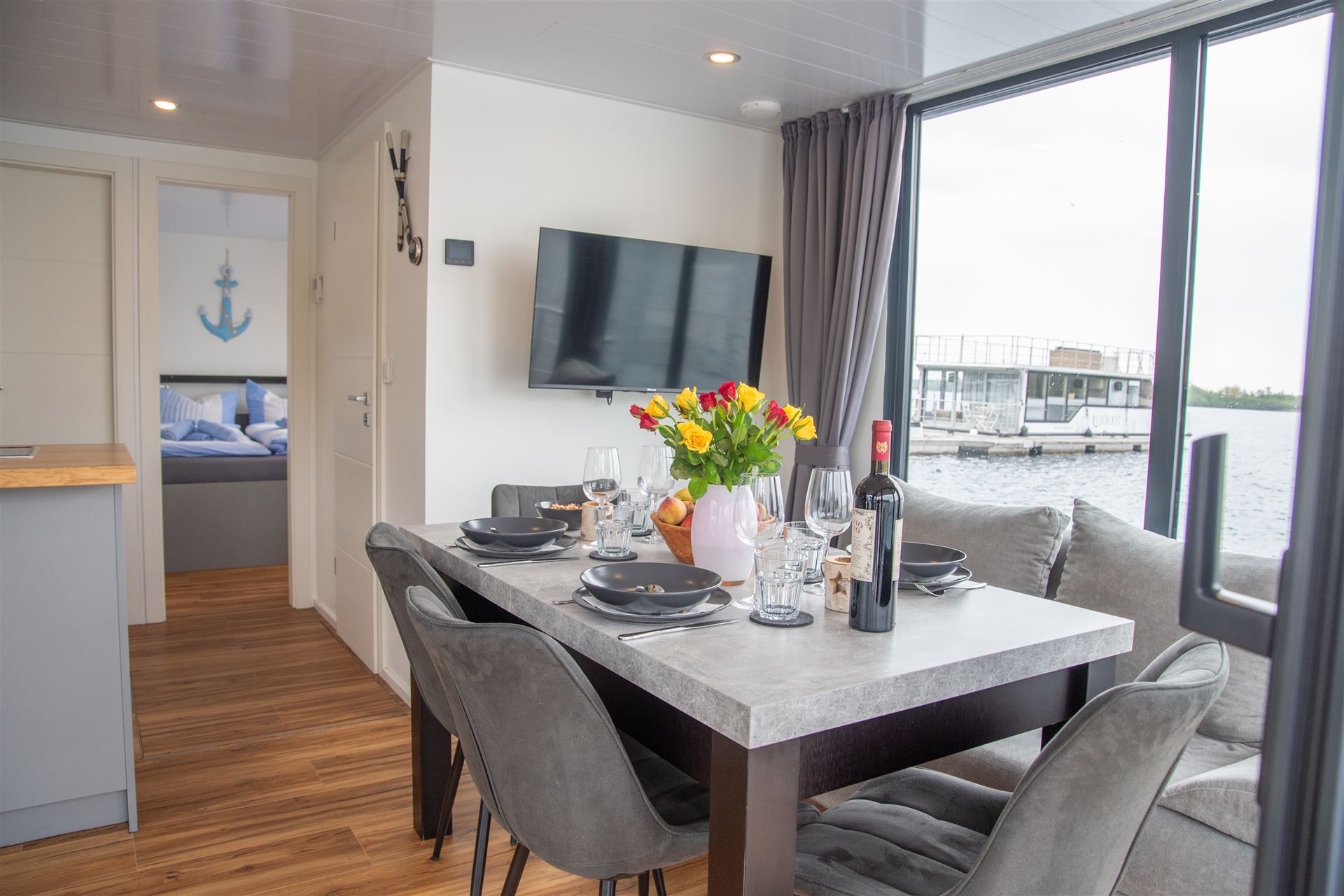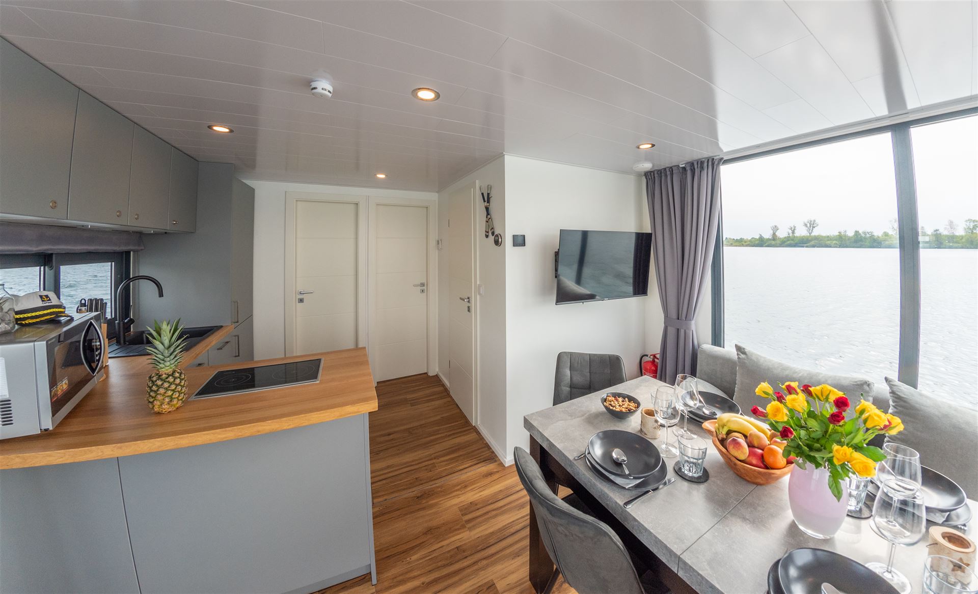 Der offene ca. 15 m² große Wohn- Essbereich ist mit einer modernen Einbauküche, Geschirrspülmaschine, einem großen Kühlschrank und Gefrierfach ausgestattet. In dem Wohnbereich befindet sich ein Esstisch und eine gemütliche Couch, die für 2 weitere Schlafplätze ausgezogen werden kann. Somit bietet das Hausboot Platz für 5+2 Personen. Im Wohn- und Essbereich befindet sich ein Flachbild TV, der mit einer selbstausrichtenden SAT Anlage verbunden ist. Durch die SAT Anlage haben Sie auch unterwegs einen guten TV Empfang. Durch die großen Panoramafenster haben Sie im offenen Wohn- & Essbereich einen wunderschönen Ausblick auf die Landschaft und können den einheimischen Vögeln beim Brüten zuschauen. Die Fenster können mit einem Vorhang abgedunkelt werden.