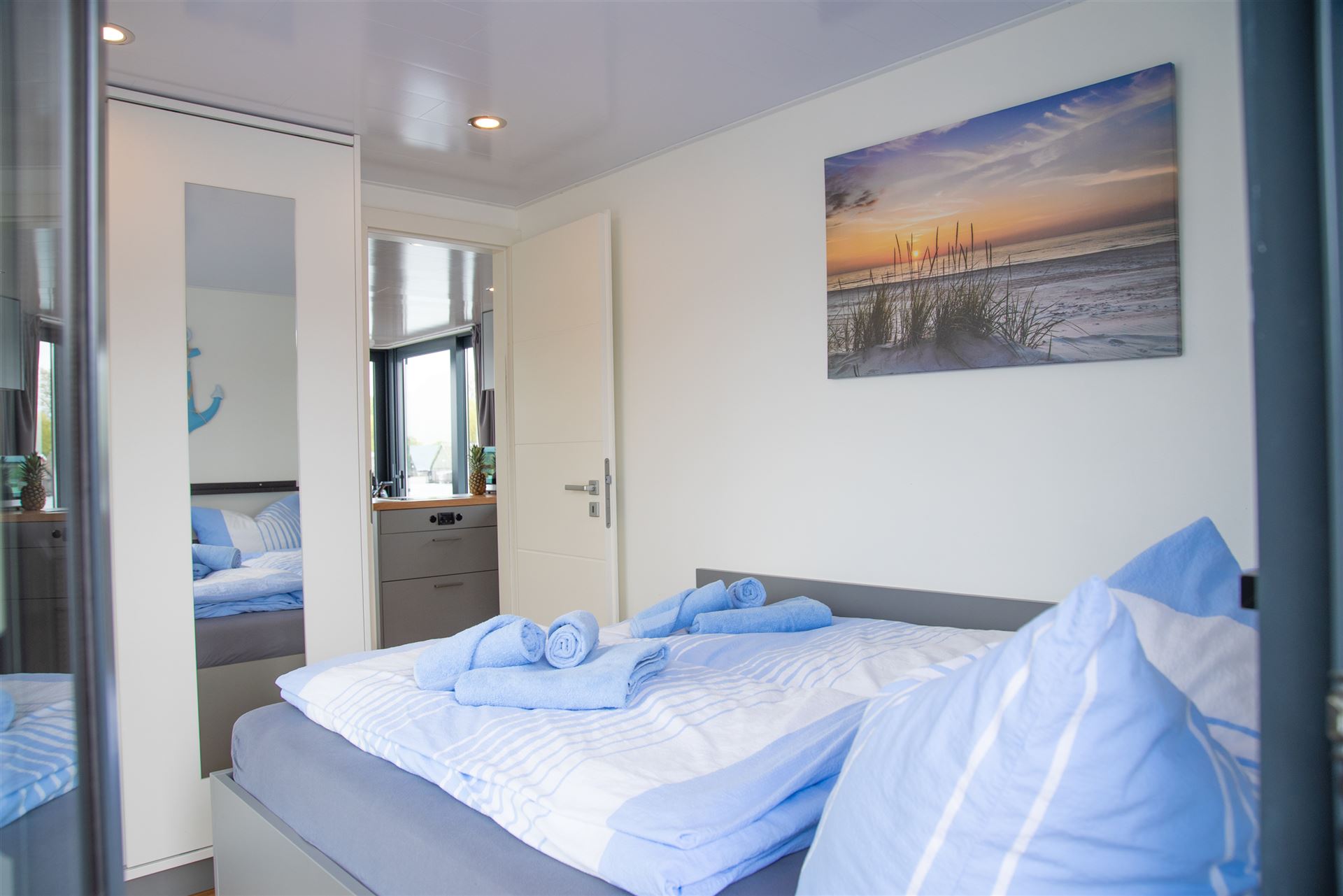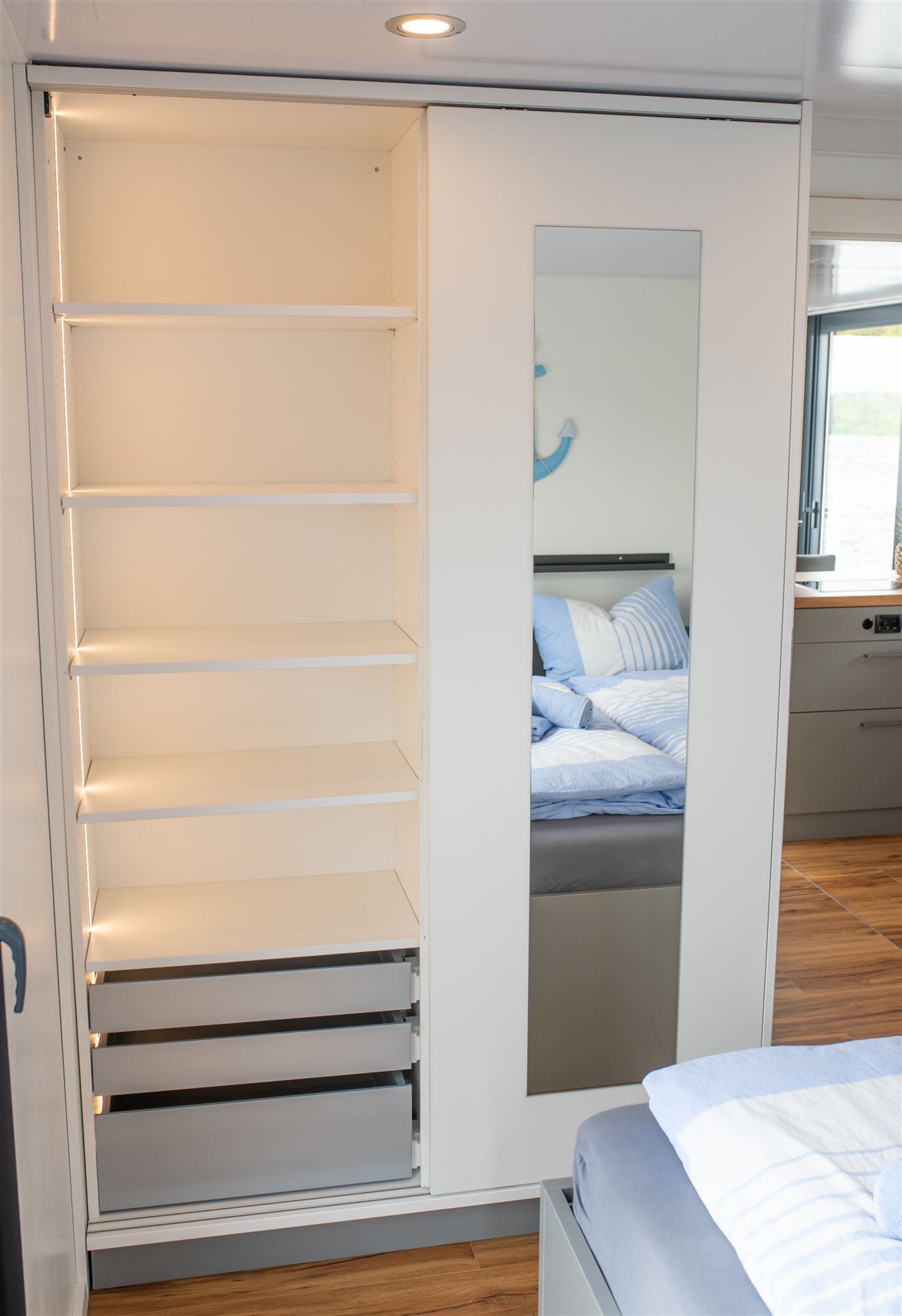 Die beiden Schlafzimmer befinden sich im Achterdeck des Mietbootes. In einem der Schlafzimmer befindet sich ein Doppelbett und ein großer Kleiderschrank. In dem Kleiderschrank haben Sie ausreichend Stauraum. Das große Panoramafenster bietet Ihnen einen tollen Ausblick über die Müritz, der Havel, dem Plauer See und allen weiteren Seen der mecklenburgischen Seenplatte.