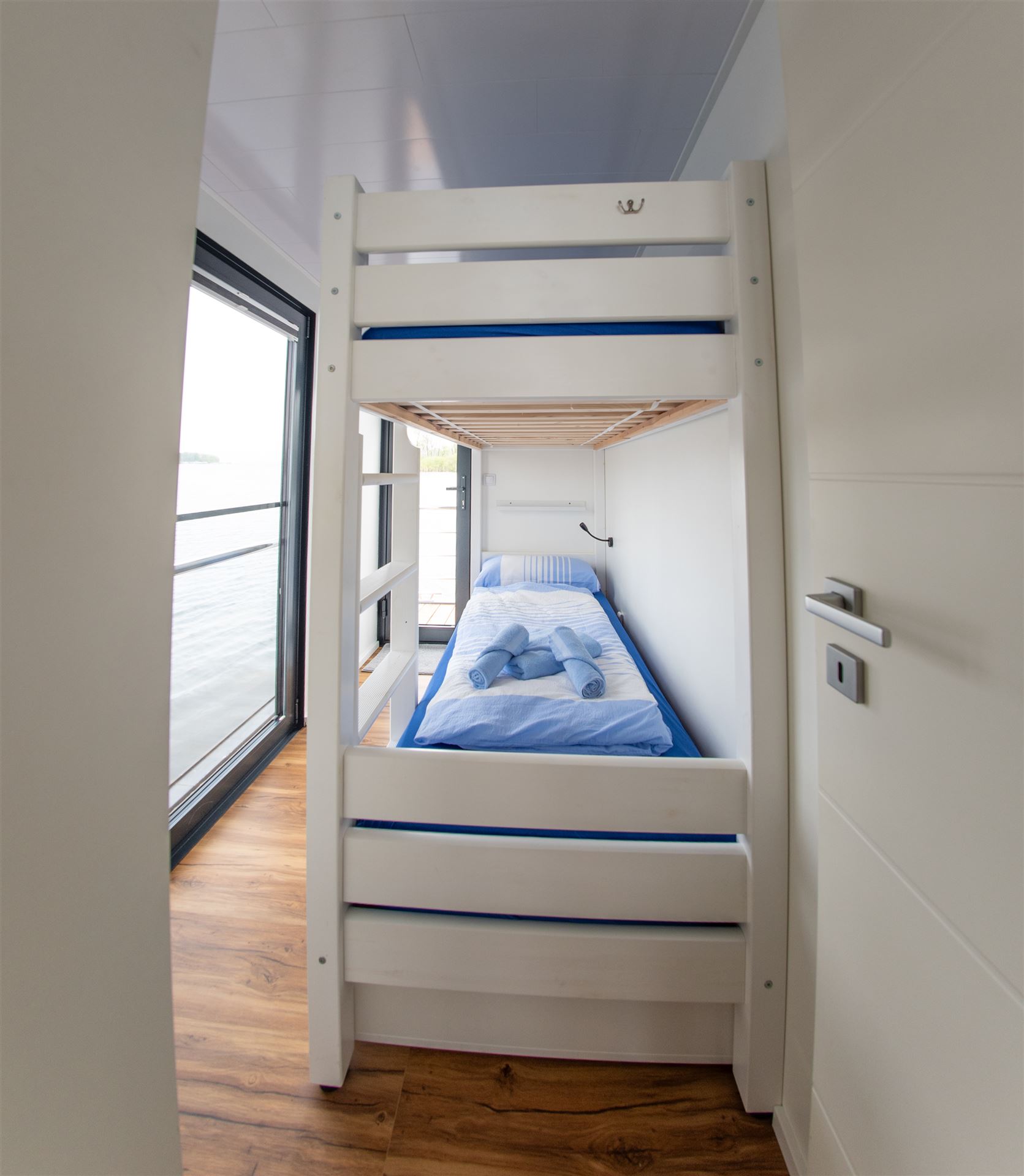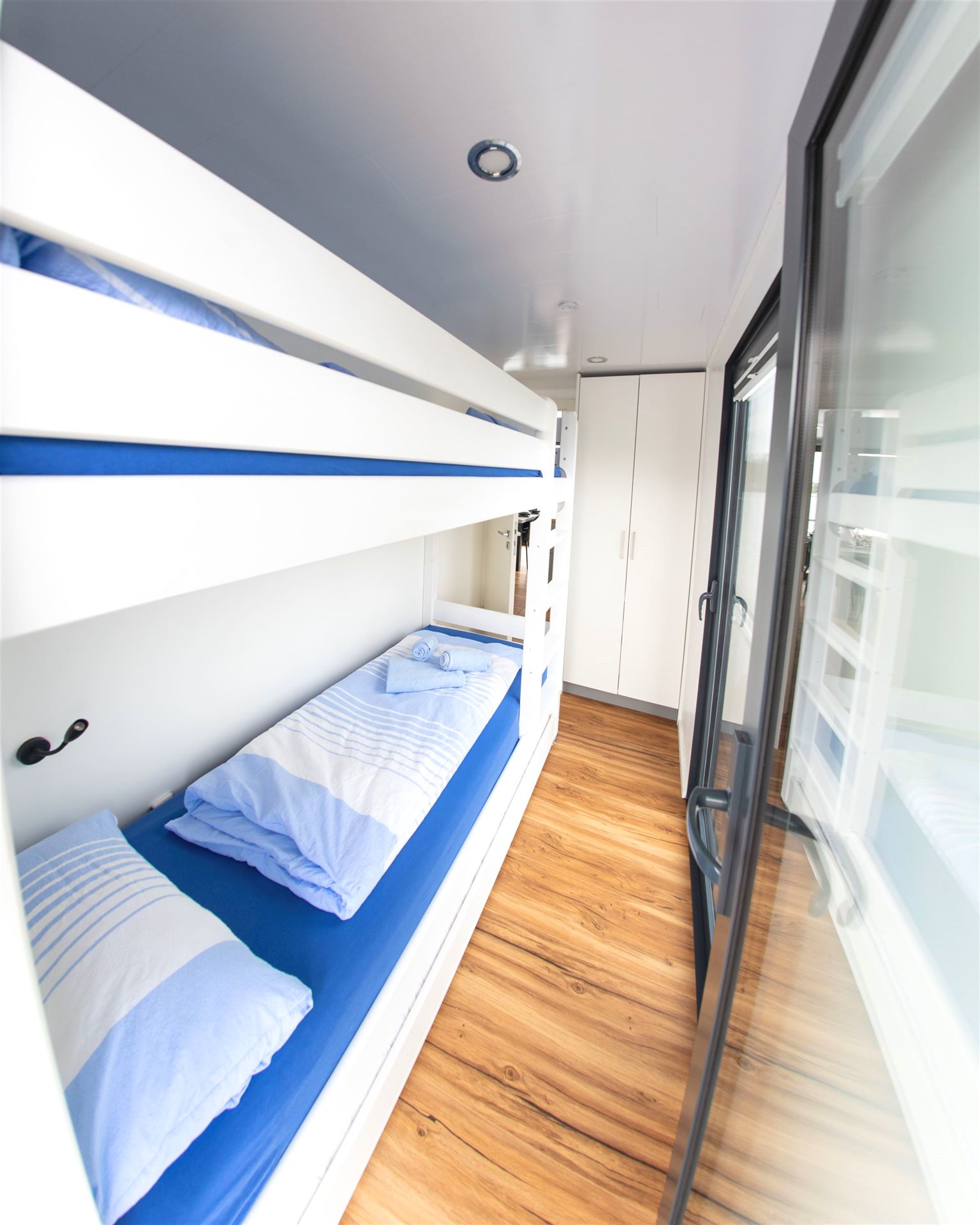 Das zweite Schlafzimmer ist mit einem Doppelstockbett und einem Kleiderschrank ausgestattet. Neben dem Hochbett kann ein weiteres Bett ausgezogen werden. Auch in diesem Schlafzimmer finden Sie Panoramafenster welche Ihnen einen freien Blick auf die wunderschöne Natur ermöglicht.