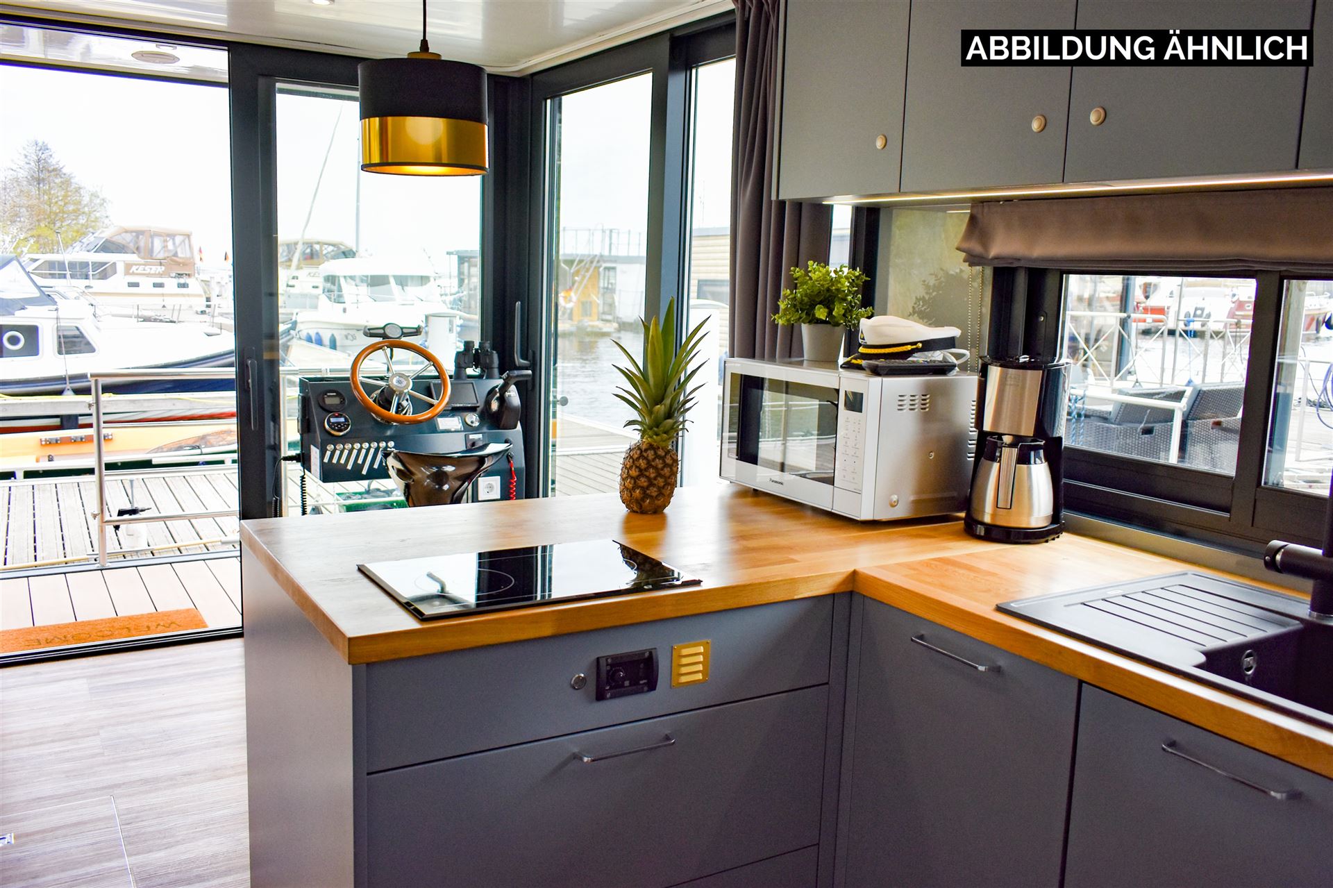 Die voll ausgestattete Küche lädt dazu ein, kulinarische Meisterwerke zu kreieren. Die Küche verfügt über einen Kühlschrank mit kleinem Gefrierfach, einen Geschirrspüler, einem Kochfeld und einen Backofen. Bitte beachten Sie, dass der Geschirrspüler und der Backofen nur mit Landstrom zu betreiben sind.