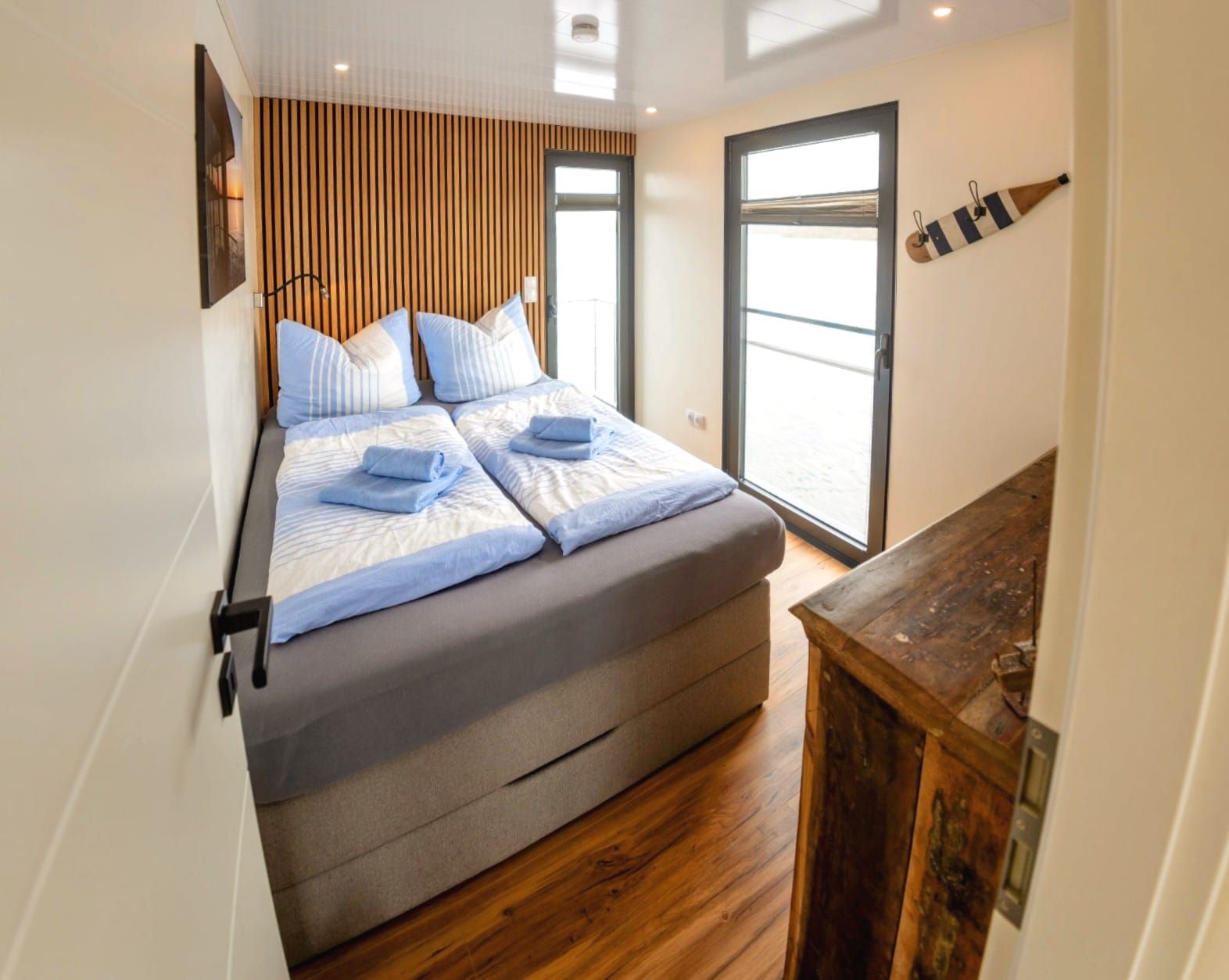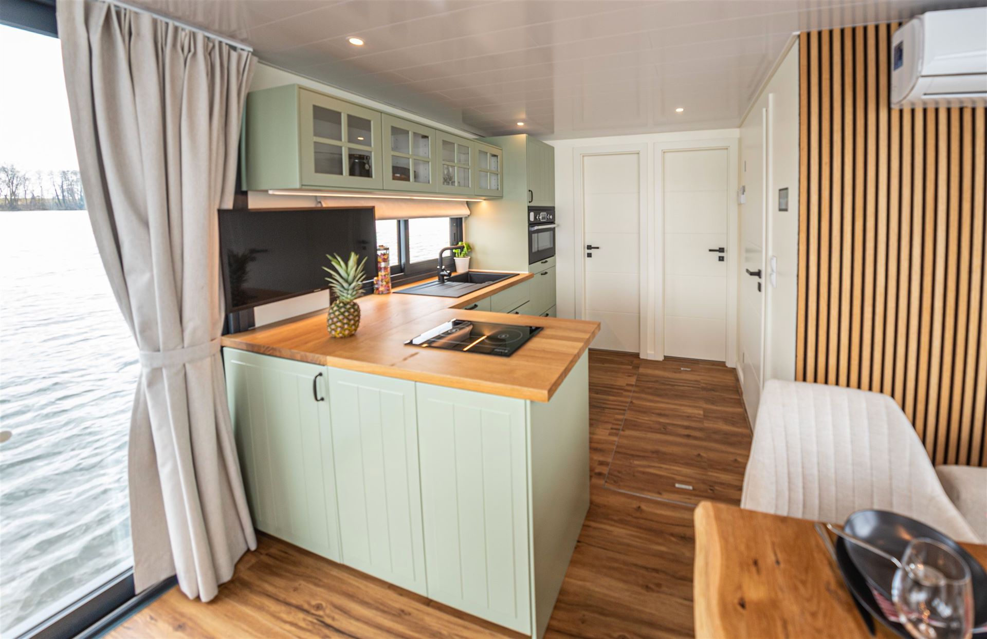 An den offenen Wohn- und Essbereich grenzen zwei Schlafzimmer an, sowie ein Bad und eine offene Küche. Das Hausboot wird komplett mit einer Fußbodenheizung beheizt.