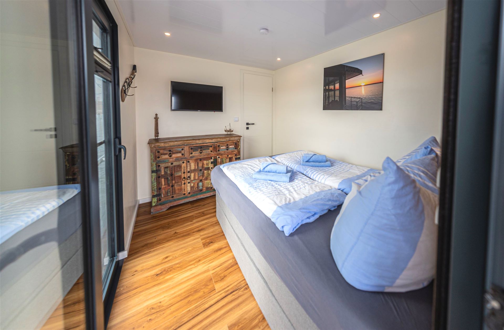 Das große Schlafzimmer verfügt über ein Boxspringbett mit einer Liegefläche von ca. 1,40 x 2m und einem Kleiderschrank. Das große Schlafzimmer des Hausbootes verfügt ebenfalls über bodentiefe Fenster, sodass Sie die Schönheit der Natur der Müritz und Umgebung auch vom Bett aus genießen können. Im Schlafzimmer ist ebenfalls ein TV zu finden.