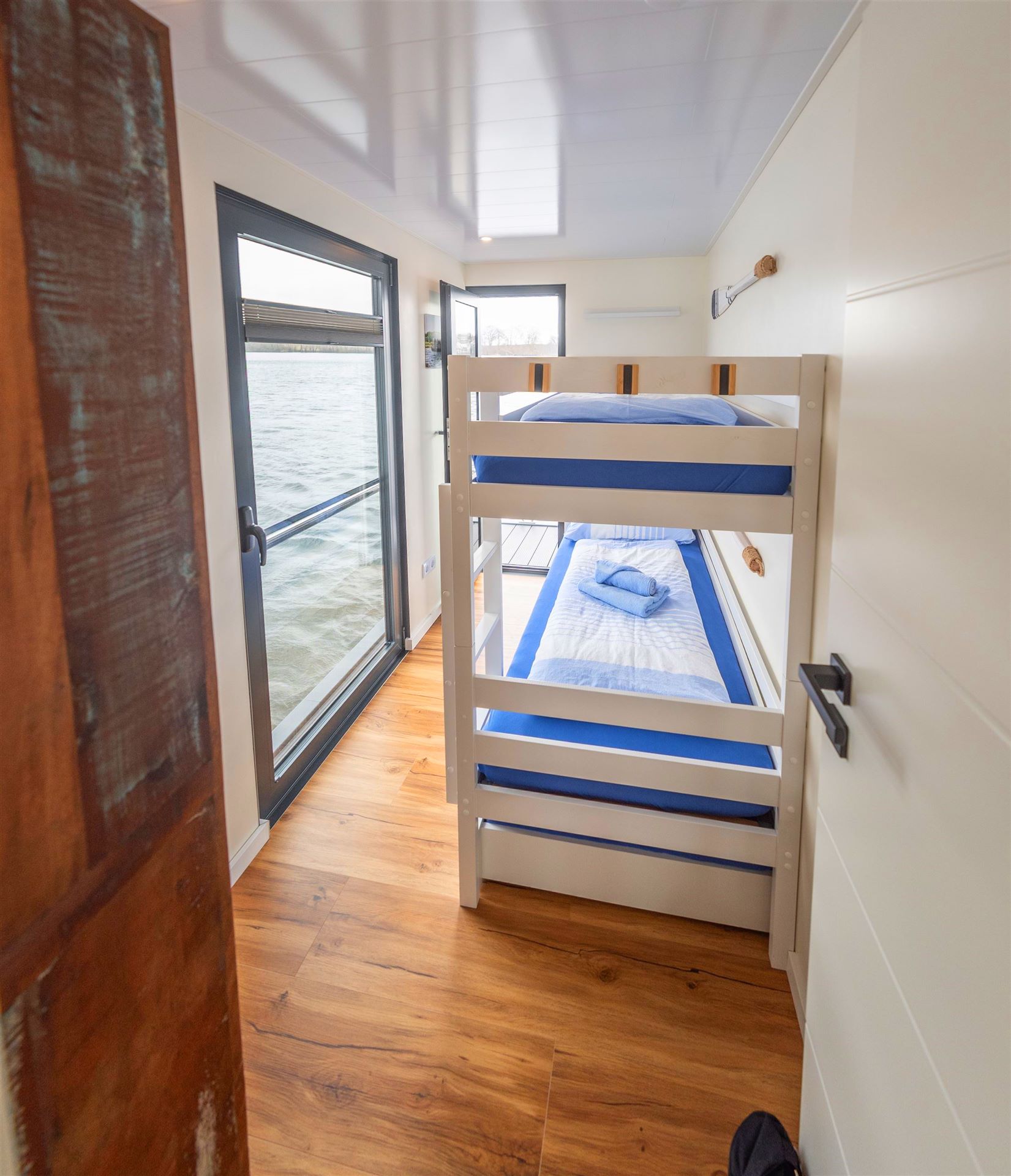 Das kleinere Schlafzimmer ist mit einem Doppelstockbett und einem Kleiderschrank ausgestattet. Auch in diesem Zimmer wurden bodentiefe Fenster verbaut.