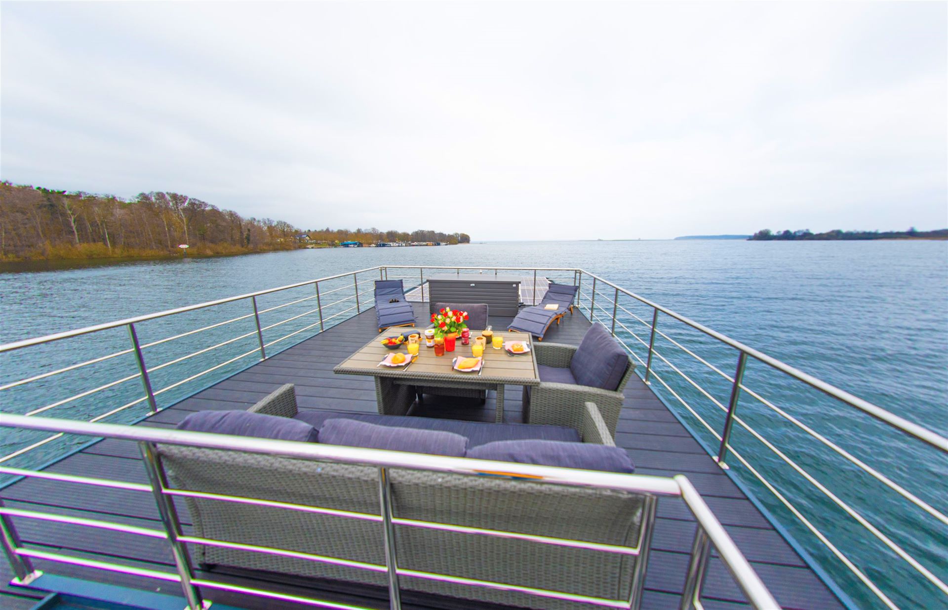 Wir laden Sie ein, an Bord zu kommen und die außergewöhnliche Mischung aus Luxus, Komfort und Freiheit zu erleben, die unser Hausboot zu bieten hat.