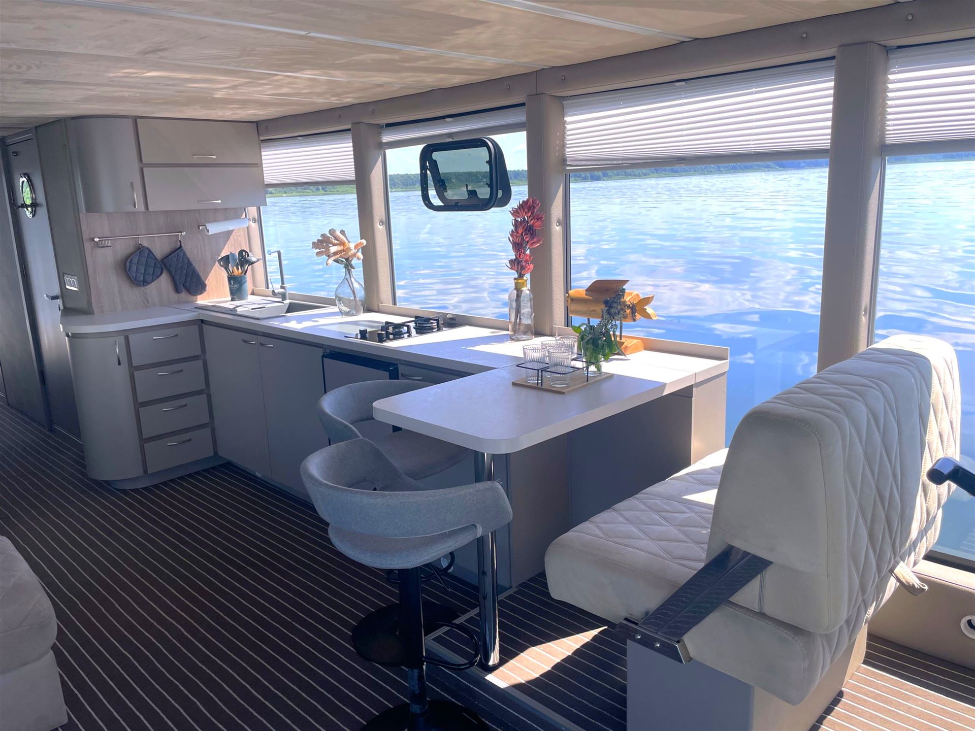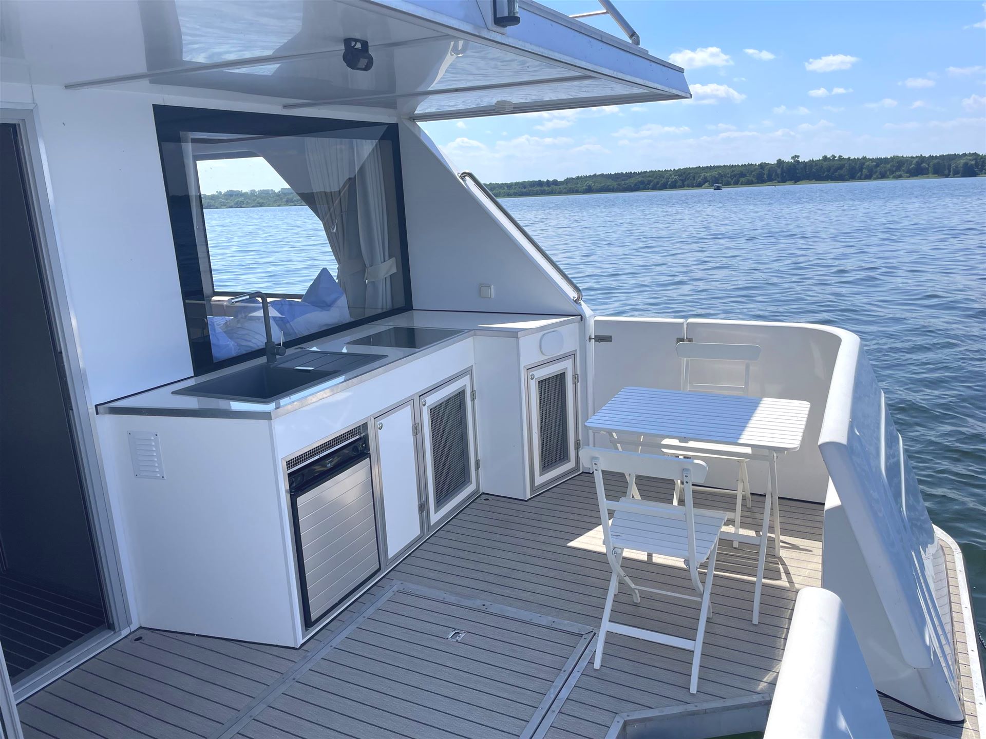 Das Hausboot verfügt über einen offenen Wohn- und Essbereich mit einer großen Küchenzeile. Das Highlight in diesem Bereich ist der integrierte Hängesessel.