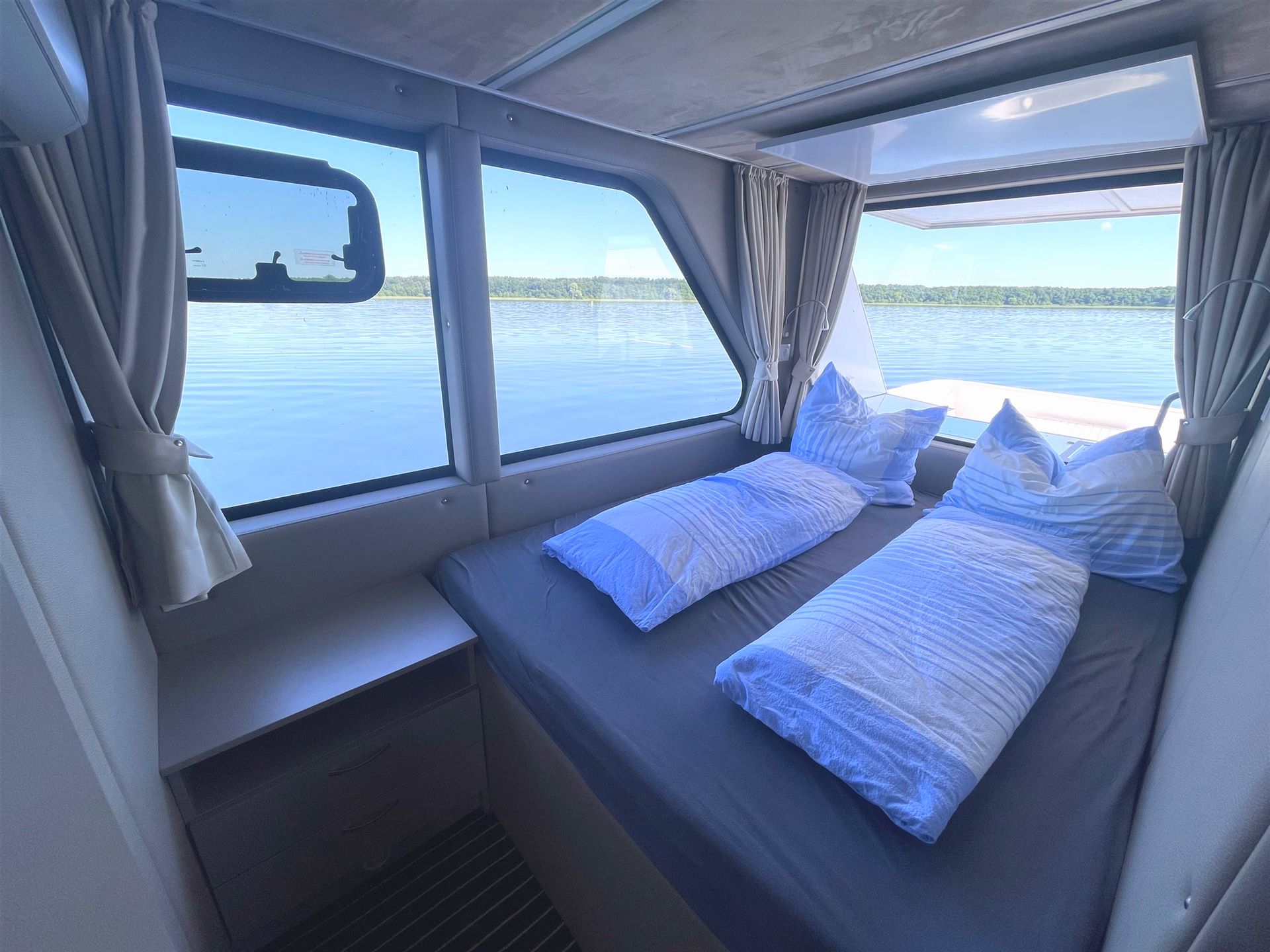 Die beiden Schlafzimmer des Bootes verfügen über jeweils ein großes Doppelbett mit einer Größe von 1,60 m x 2 m. Beide Schlafzimmer wurden komfortabel und liebevoll eingerichtet, um Ihnen eine erholsame Nachtruhe zu garantieren.
