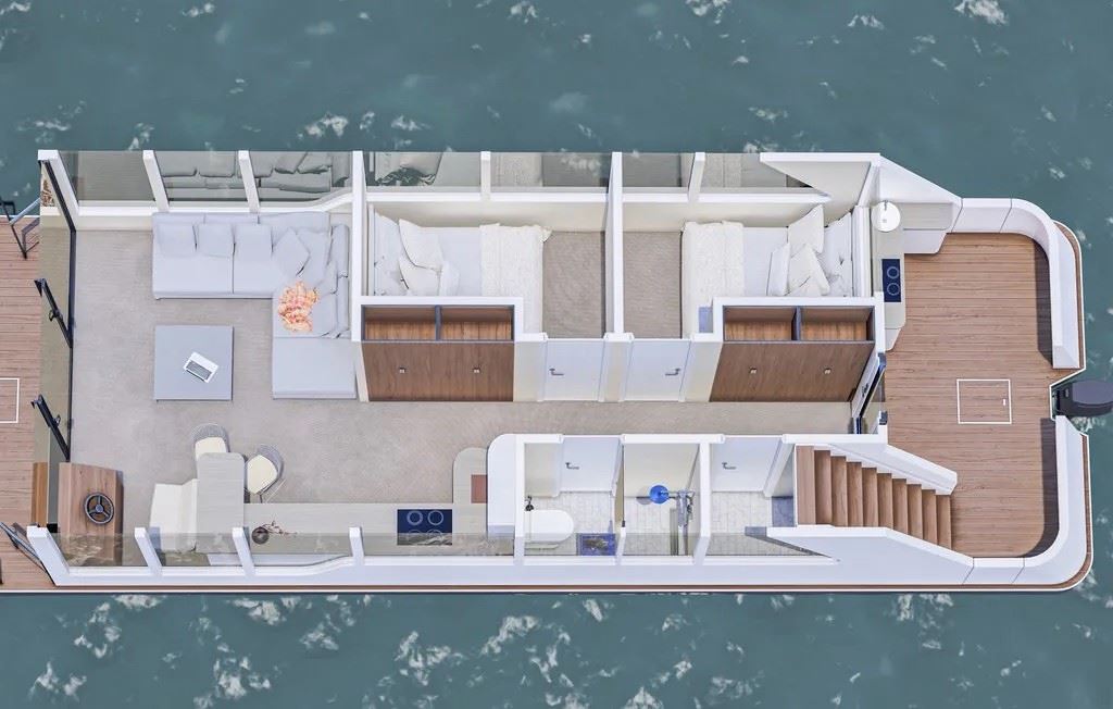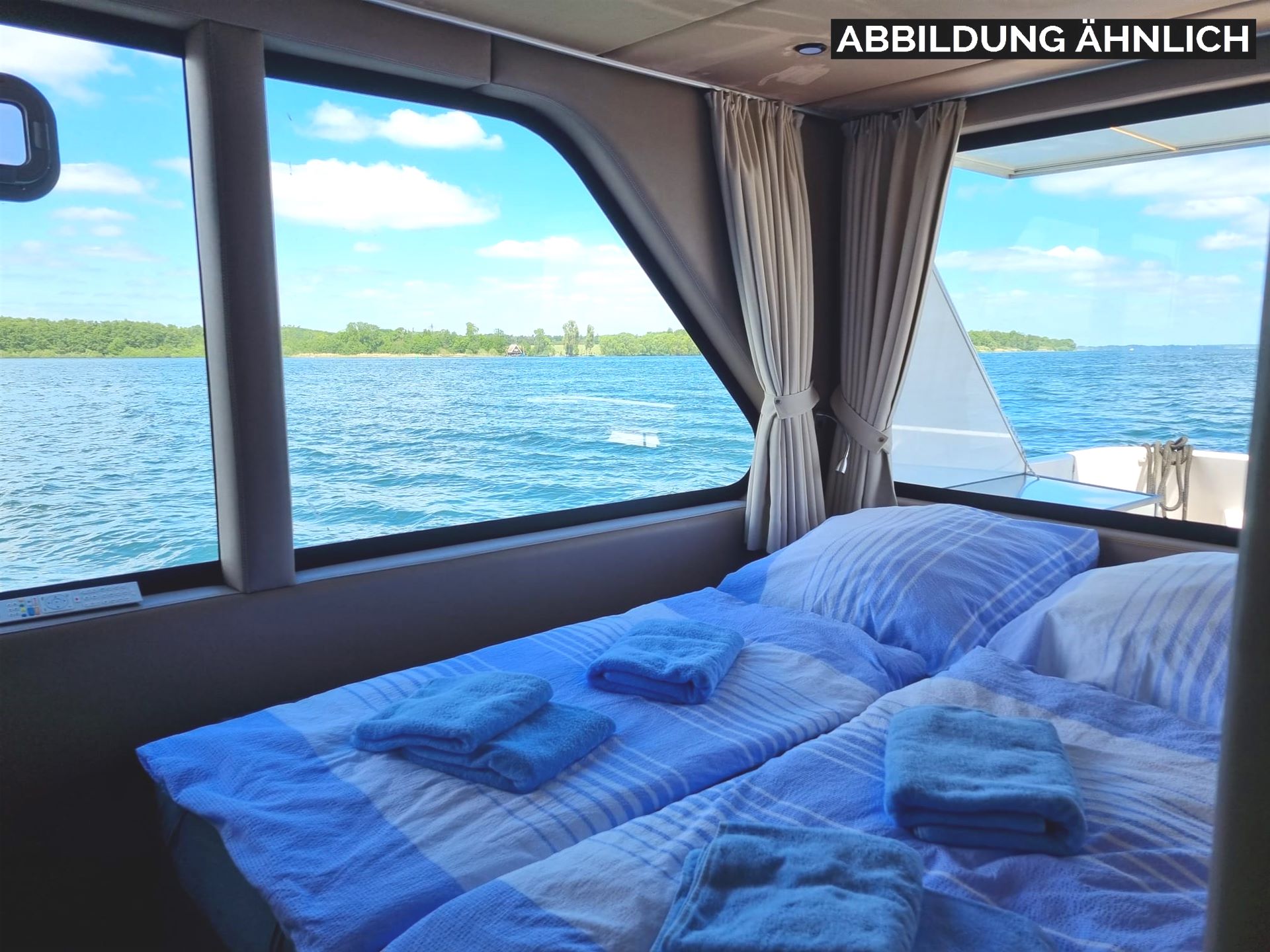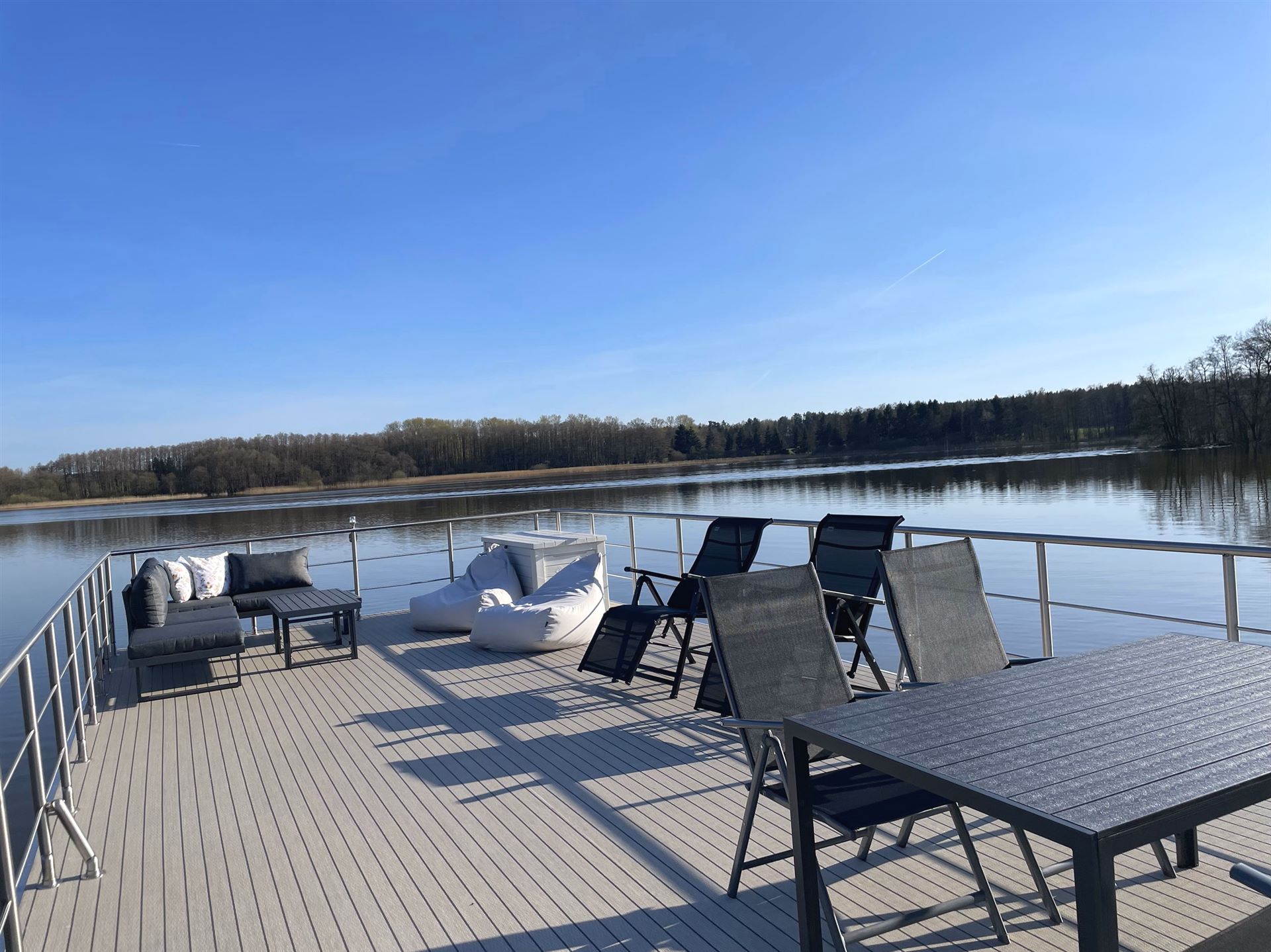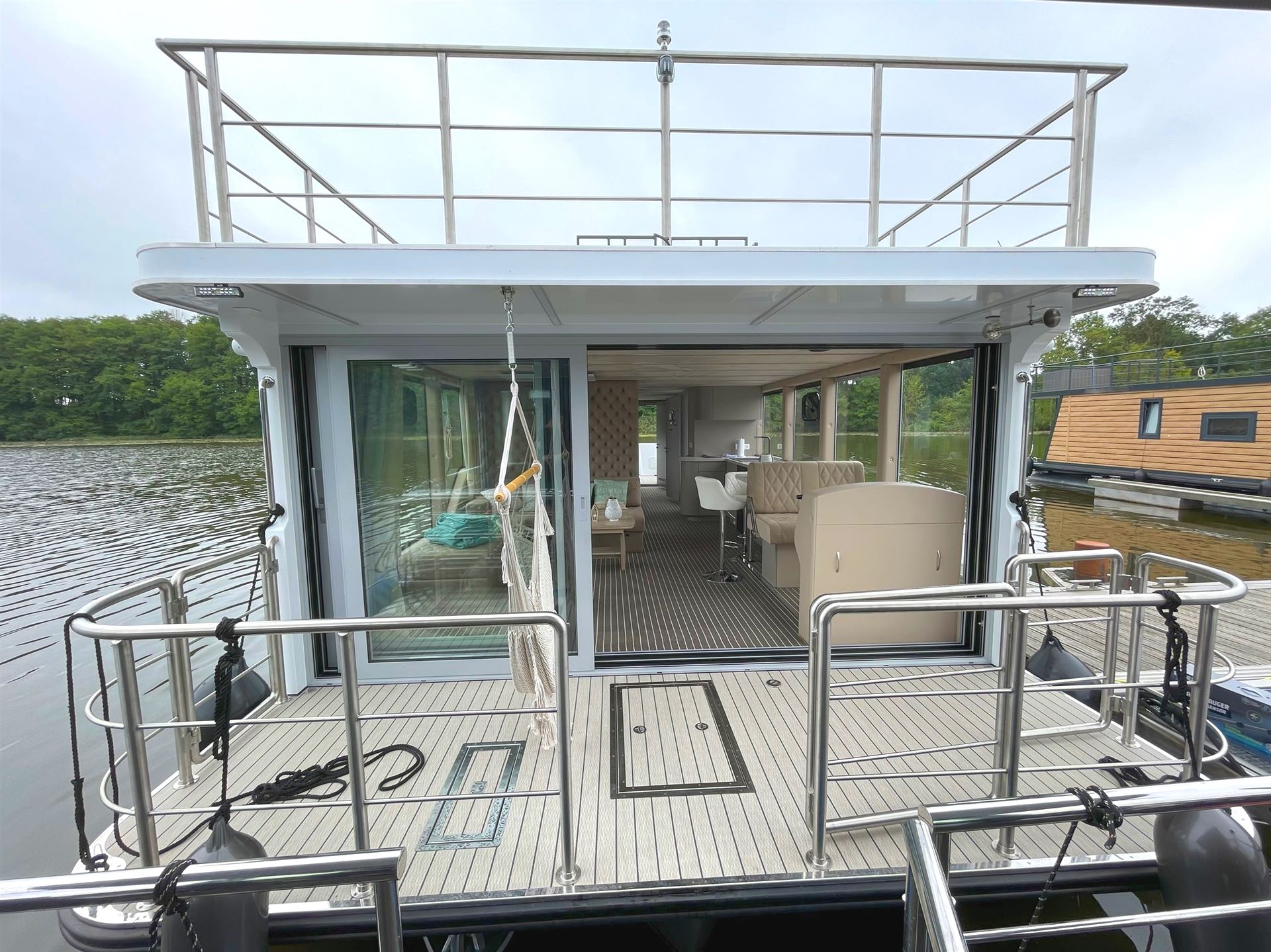 Auf der vorderen Terrasse genießen Sie entspannte Stunden im Hängesessel, während die großzügige Dachterrasse mit traumhaftem Ausblick auf die Müritz der perfekte Ort für Sonnenuntergänge ist. Die praktische Heckküche erlaubt es Ihnen, Speisen direkt im Freien zuzubereiten – für echtes Outdoor-Feeling auf dem Wasser.