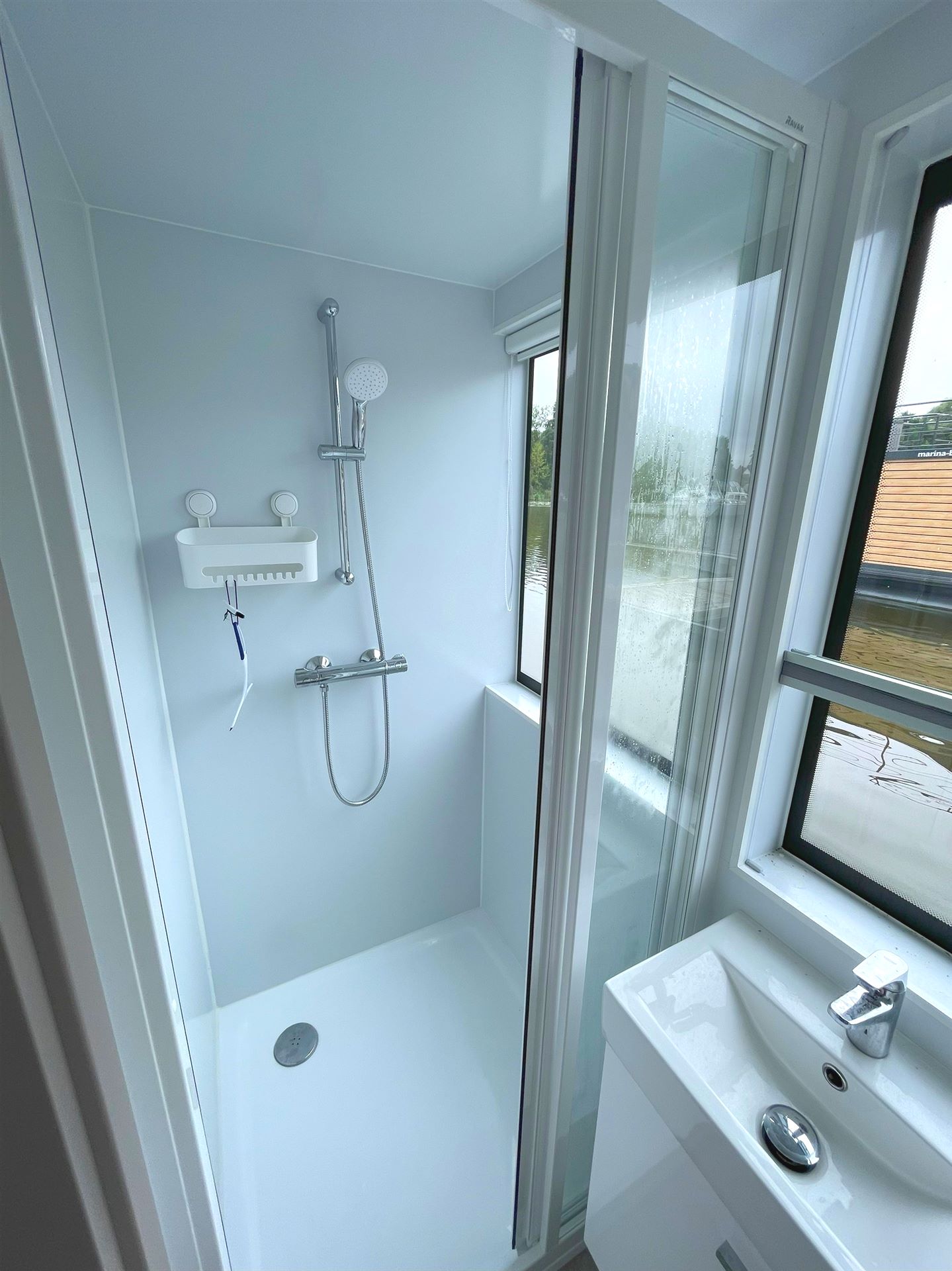 Nach einem erfrischenden Sprung in die Müritz über die Badeleiter sorgt die Außendusche für angenehme Abkühlung.